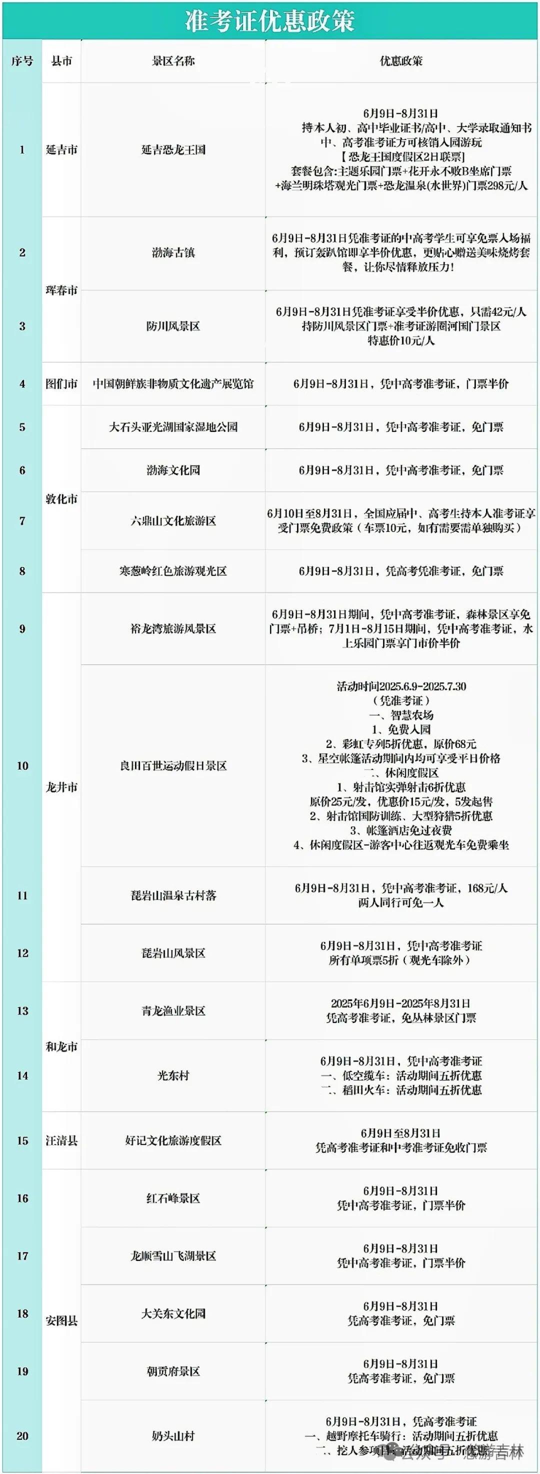 高句麗文物古蹟景區、五女峯國家森林公園、鴨綠江國門景區、雲峯湖景區、輝南龍灣景區、雲嶺野山參風景區:6月7日—8月31日,全國高考生憑本人准考證免門票。