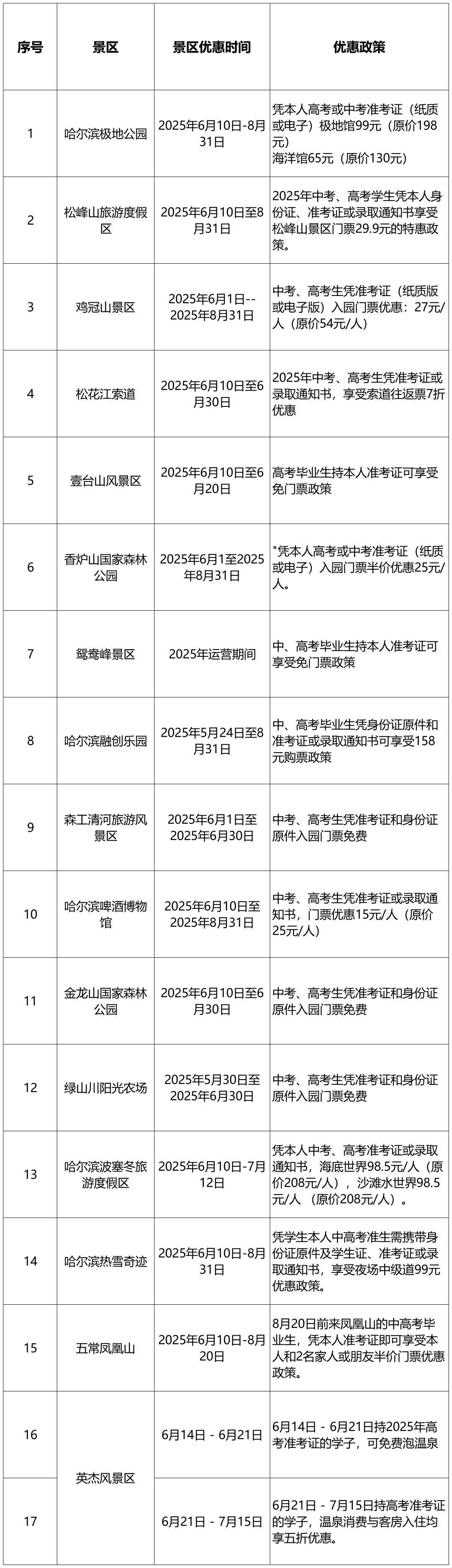 西遞、宏村、南屏、屏山、打鼓嶺、木坑竹海、盧村、塔川、五溪山、石林景區:6月9日—8月31日,2025年中高考學生憑本人准考證和身份證免門票。