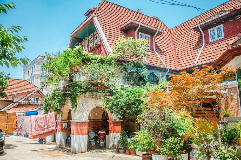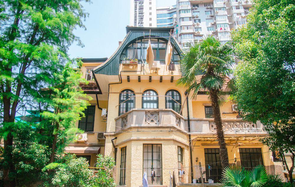 這棟花園住宅建於上世紀二十年代,爲傳統德國式建築。主體和副體由廊道相連接,形成了獨有的戶外空間。主體爲三層磚木結構,主立面兩端凸出各形成山牆面,另設有單坡棚屋形和三坡形老虎窗。半露明木構架、紅瓦陡坡屋頂與白色拉毛外牆頗有歐洲鄉村別墅的觀感。底層的敞廊也十分有特色,內圓外方,將傳統中式元素融匯其中。