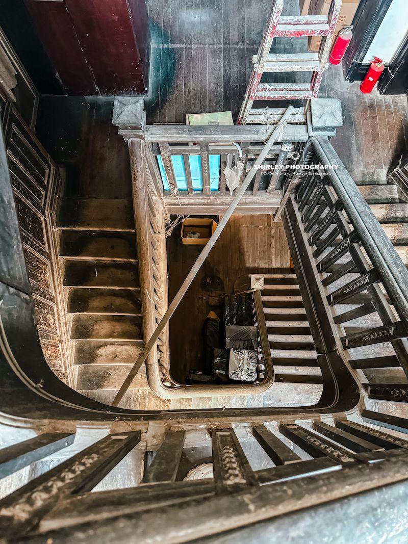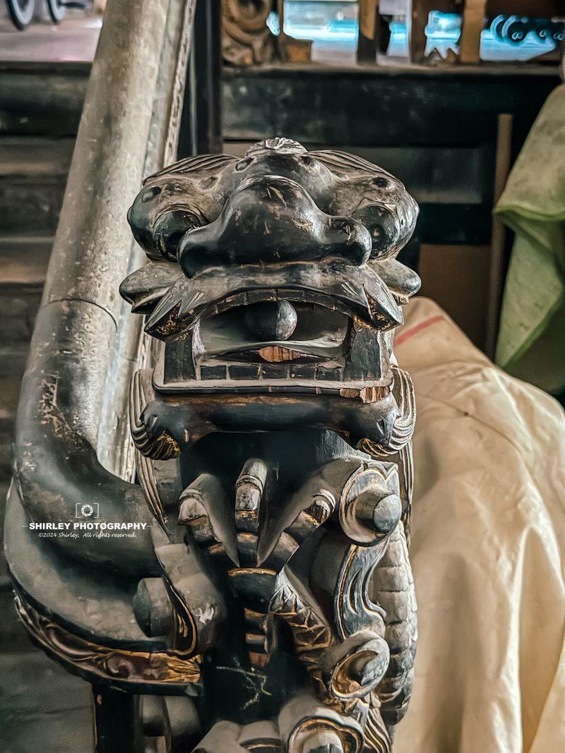公共空間裏最令人矚目的便是樓梯轉角處的雕花立柱,立柱頂部雕刻爲獅頭,造型栩栩如生,獅頭口中含有一珠,跨越三個世紀整根柱子金漆尚存,在昏暗的室內依舊難掩光彩,霸氣凌人。