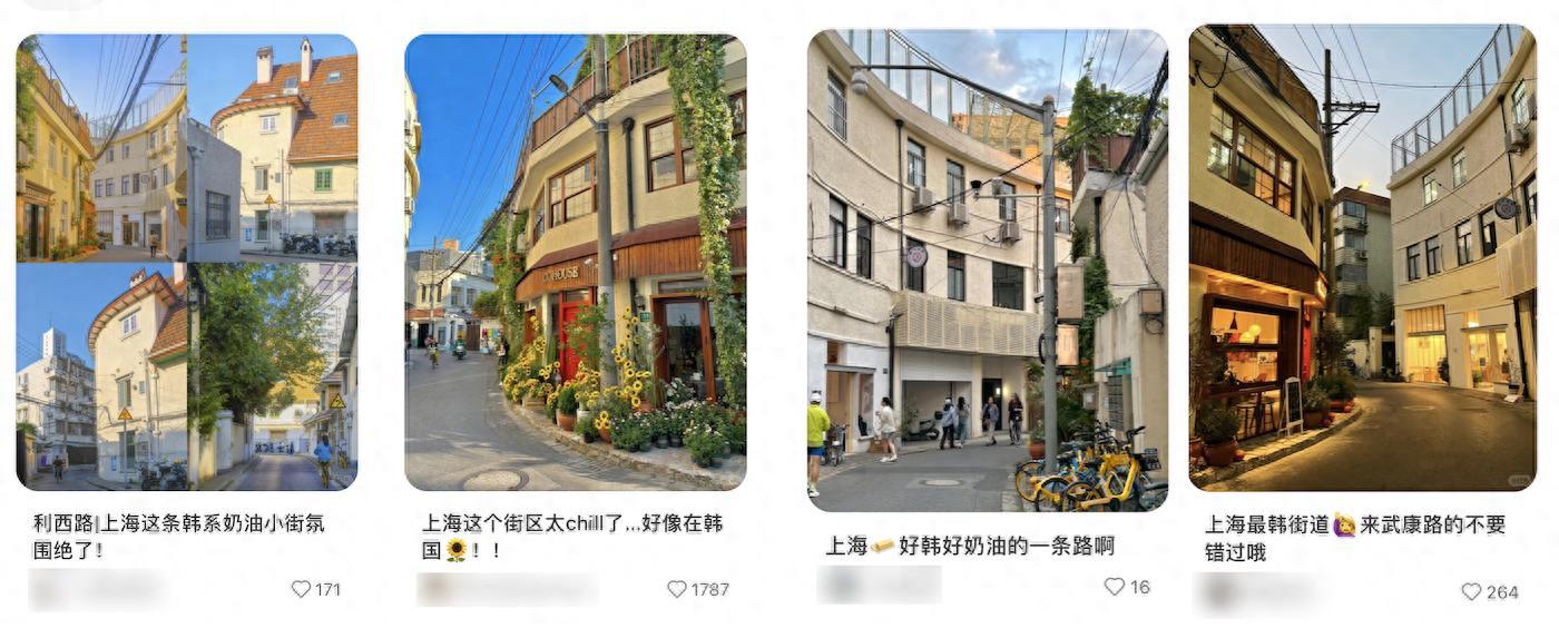 在一些社交平臺上,低調許久的利西路不知何時有了“魔都小首爾”、“韓系小馬路”、“上海最韓街道”這樣讓人摸不着頭腦的標籤。善於拍攝取景的網紅博主們在高P濾鏡之下,將鏡頭對準街上僅有的幾家咖啡館、餐廳,營造出身在韓國小巷的既視感。