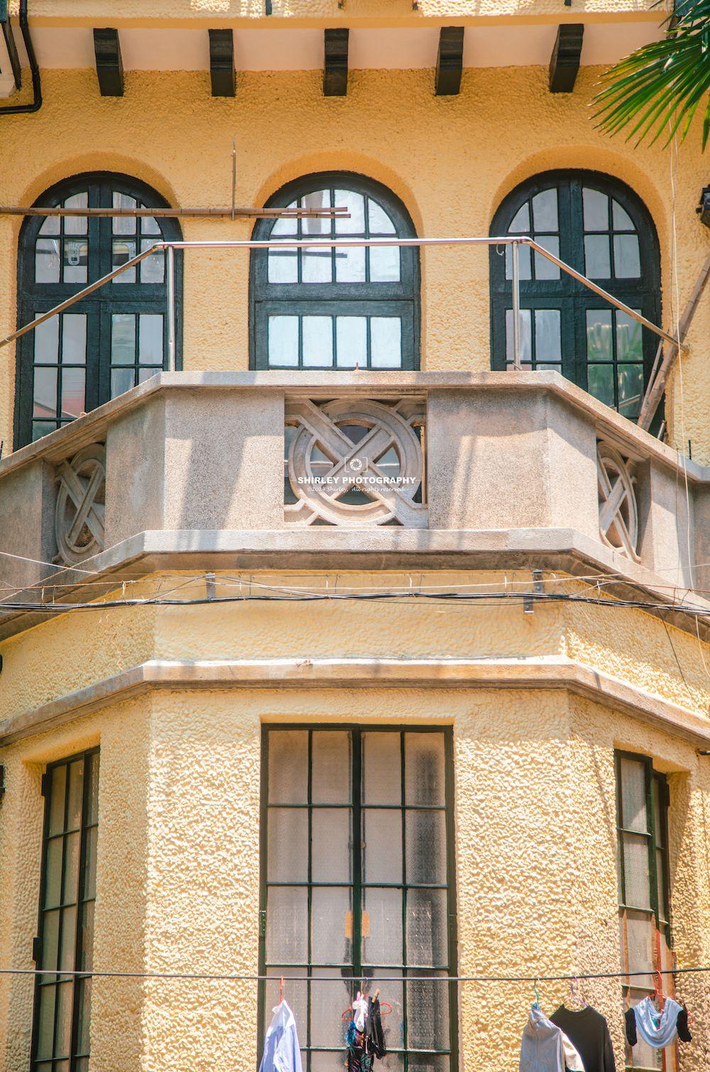 建築最標誌性的就是朝南的弧形陽臺,有大面積的玻璃窗採光,冬季日照充足。陽臺上下還雕刻有中式元素花紋和八卦鏡圖案,中西元素在這裏交融碰撞。