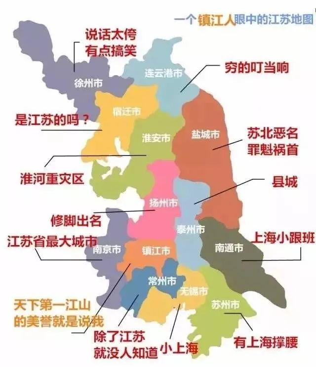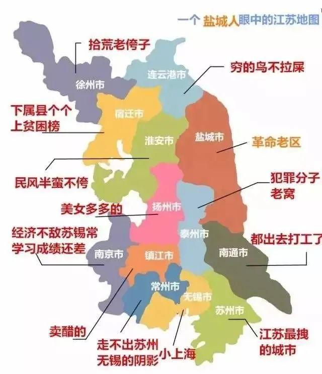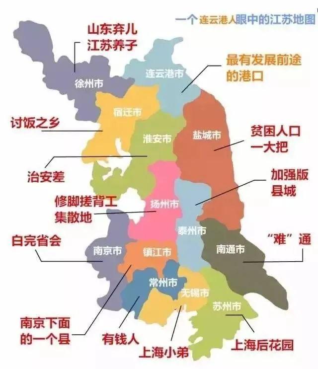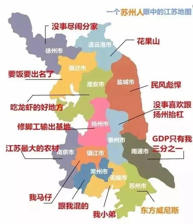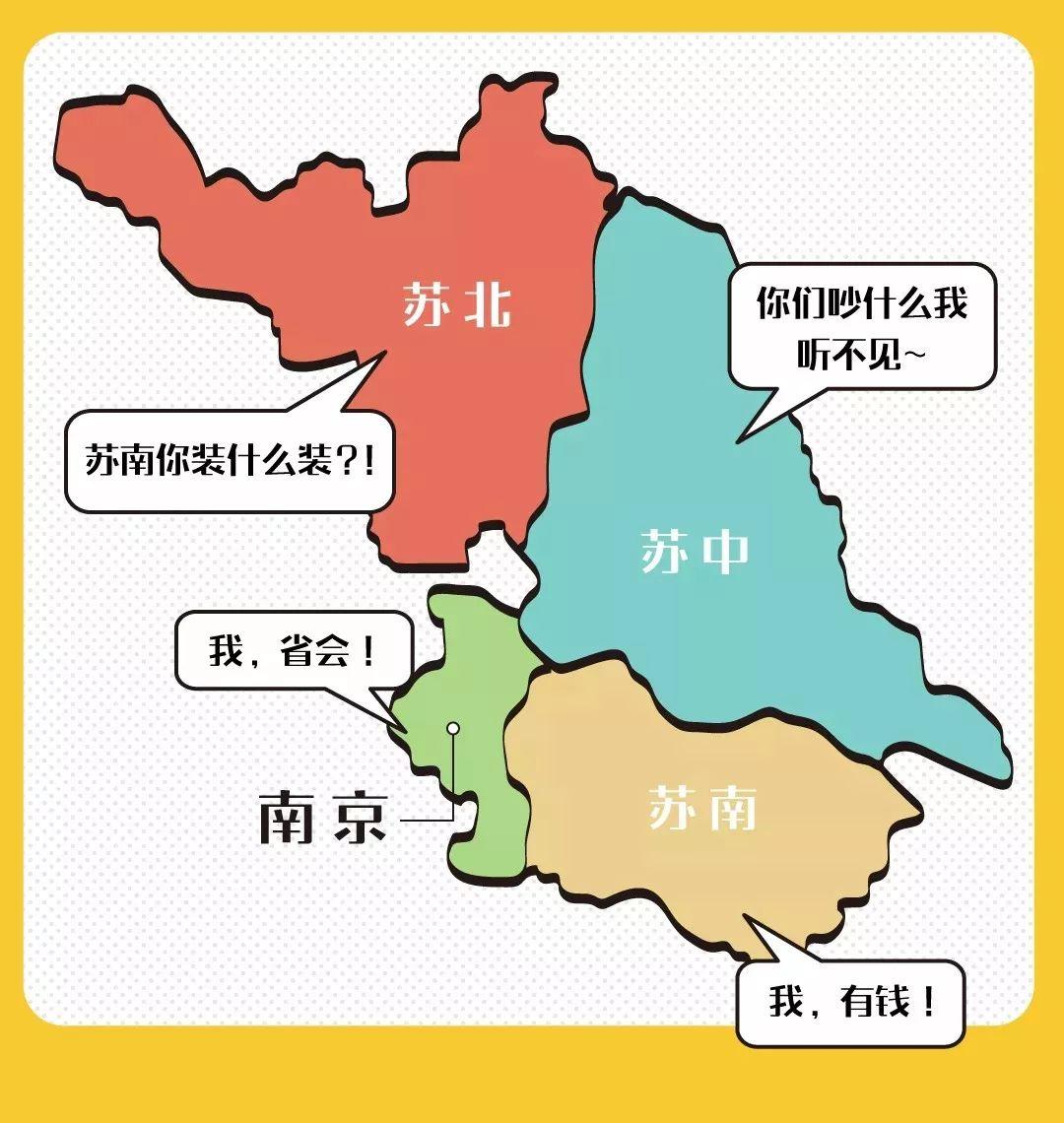 蘇南看不起蘇北,認爲蘇北是窮鄉僻壤,而蘇北則說蘇南全是暴發戶,至於蘇中是薛定諤般的蘇中。