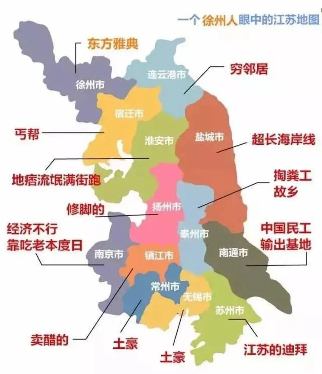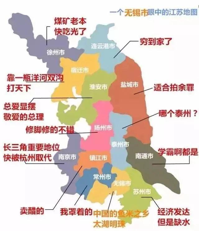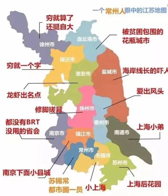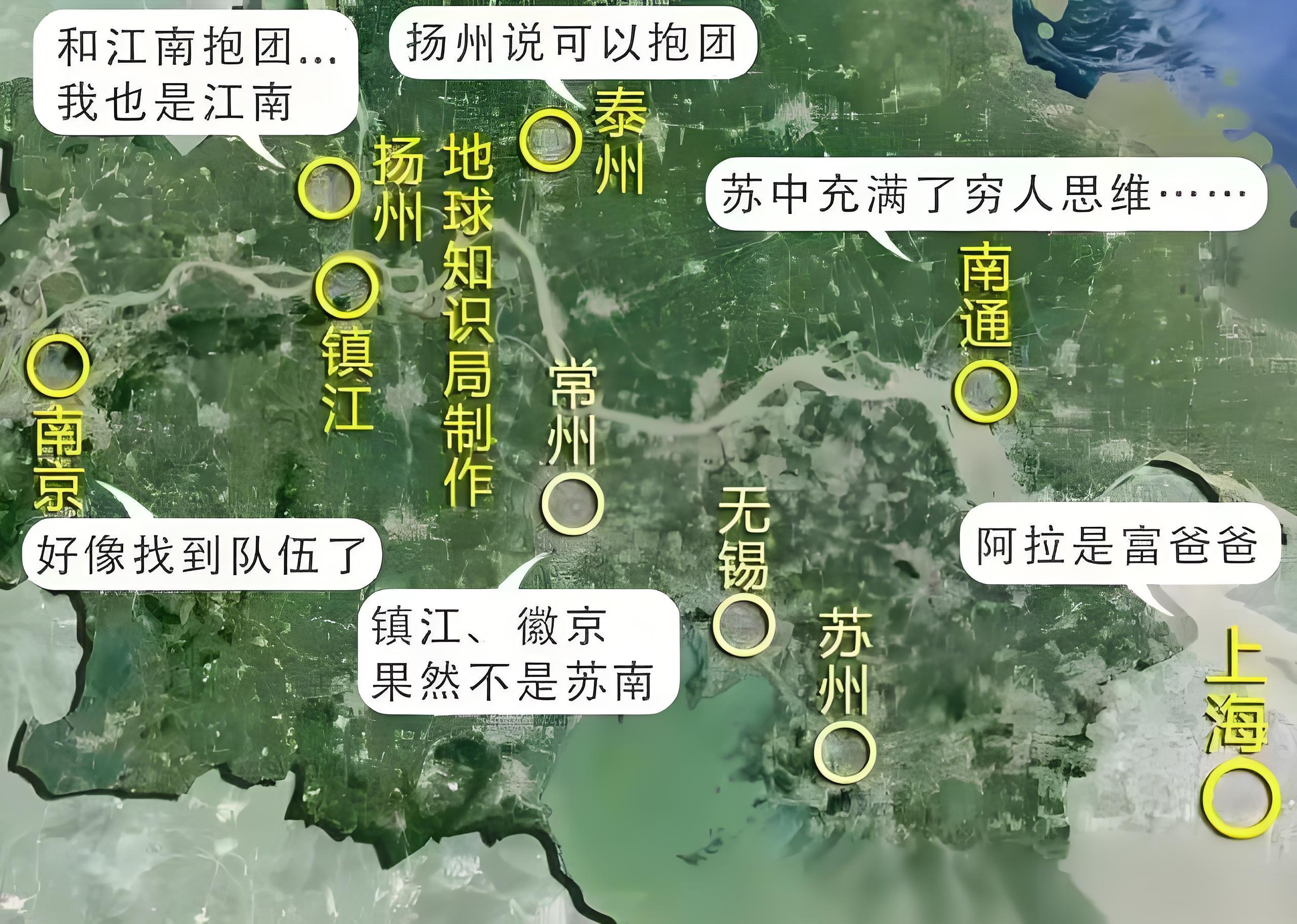 蘇南看不起蘇北,認爲蘇北是窮鄉僻壤,而蘇北則說蘇南全是暴發戶,至於蘇中是薛定諤般的蘇中。