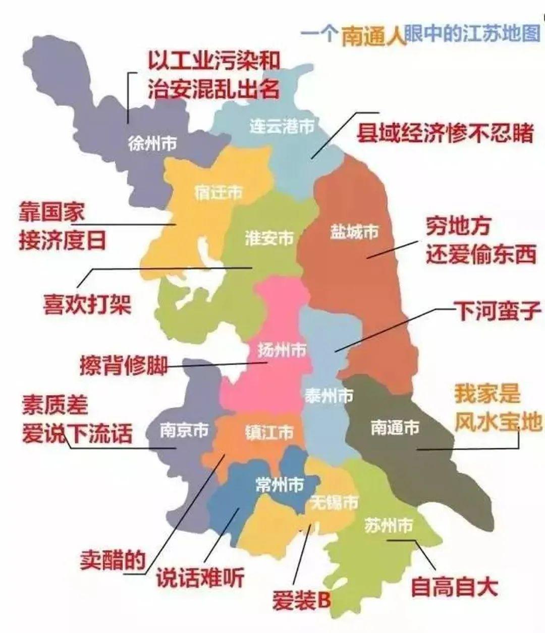 蘇南人嘲笑蘇中:“都是剛波寧(江北人),非要自稱‘蘇中’?”宿遷淮安等地區則會在自稱“蘇北”的蘇中地區人邪魅一笑,語言都不一樣,休想進家門。