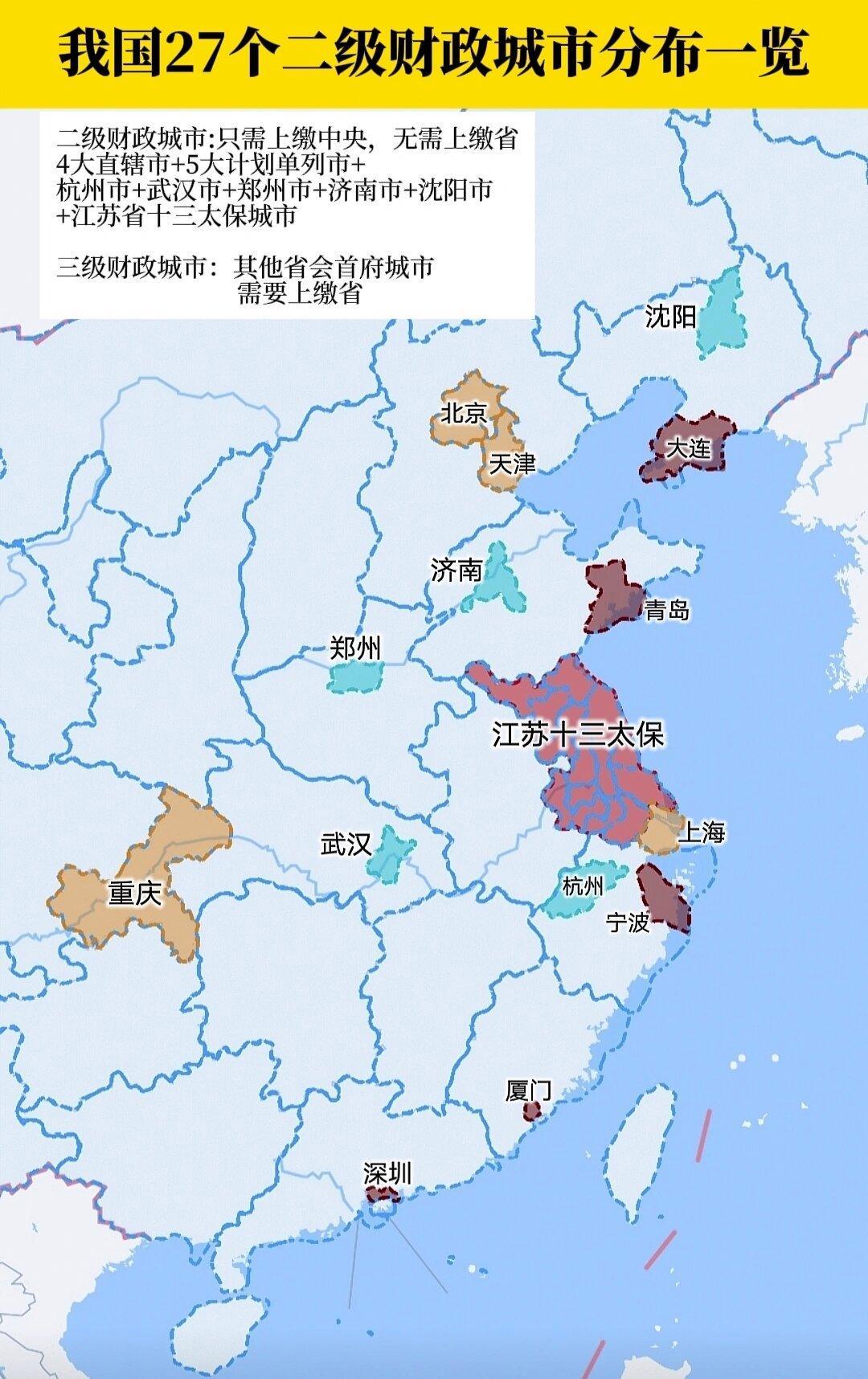 還有一個熱知識,我國27個二級財政城市中13個在江蘇。也就是說,江蘇的十三太保在財政級別上是和江蘇省平級的,都是直接和中央對接。