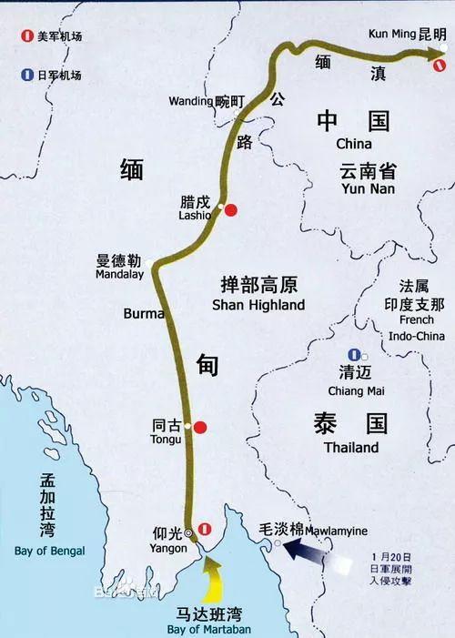 滇緬公路,東起昆明西山,西抵中緬邊境畹町,穿越橫斷山脈最兇險的怒江大峽谷,途經大理、保山、龍陵、芒市,直通緬甸臘戍。