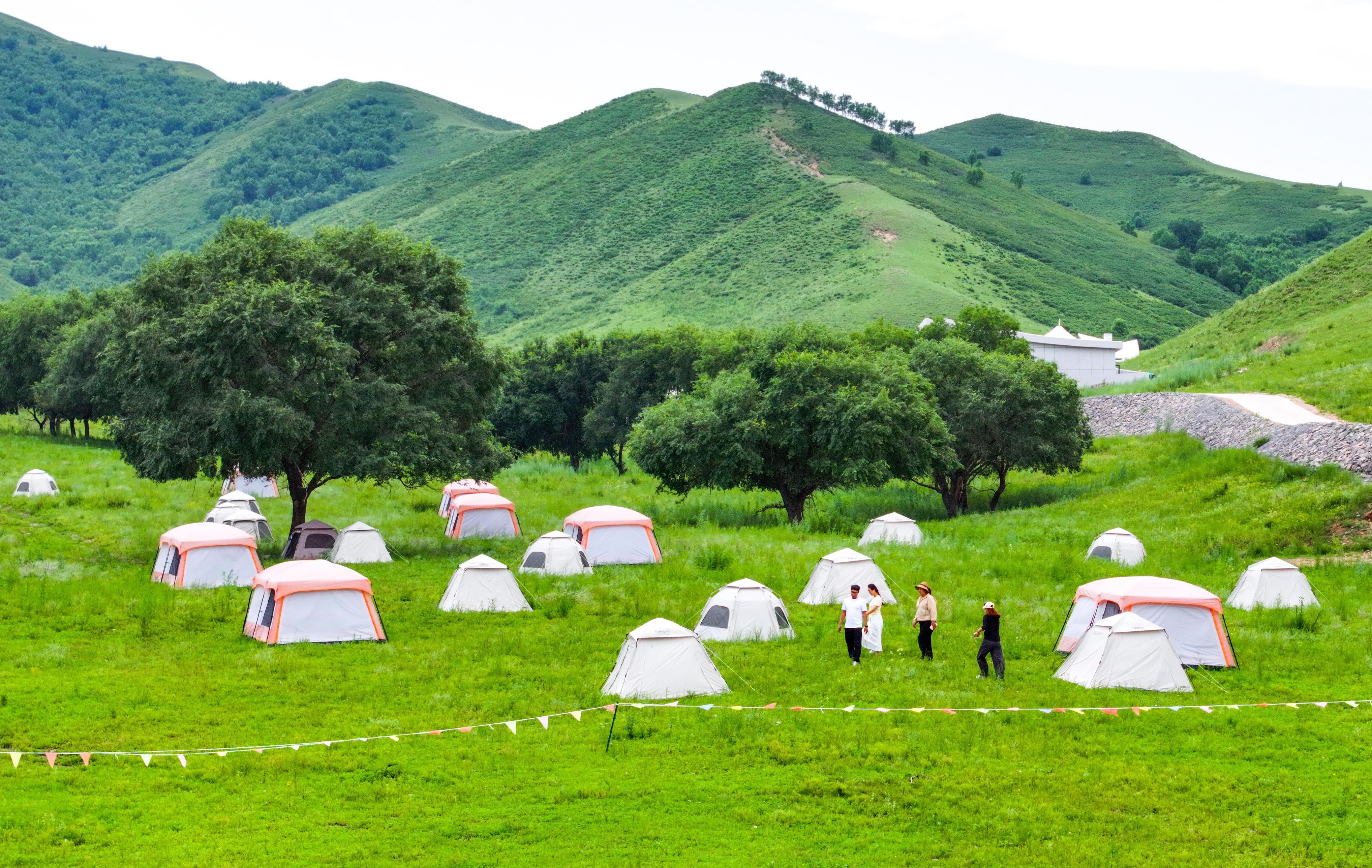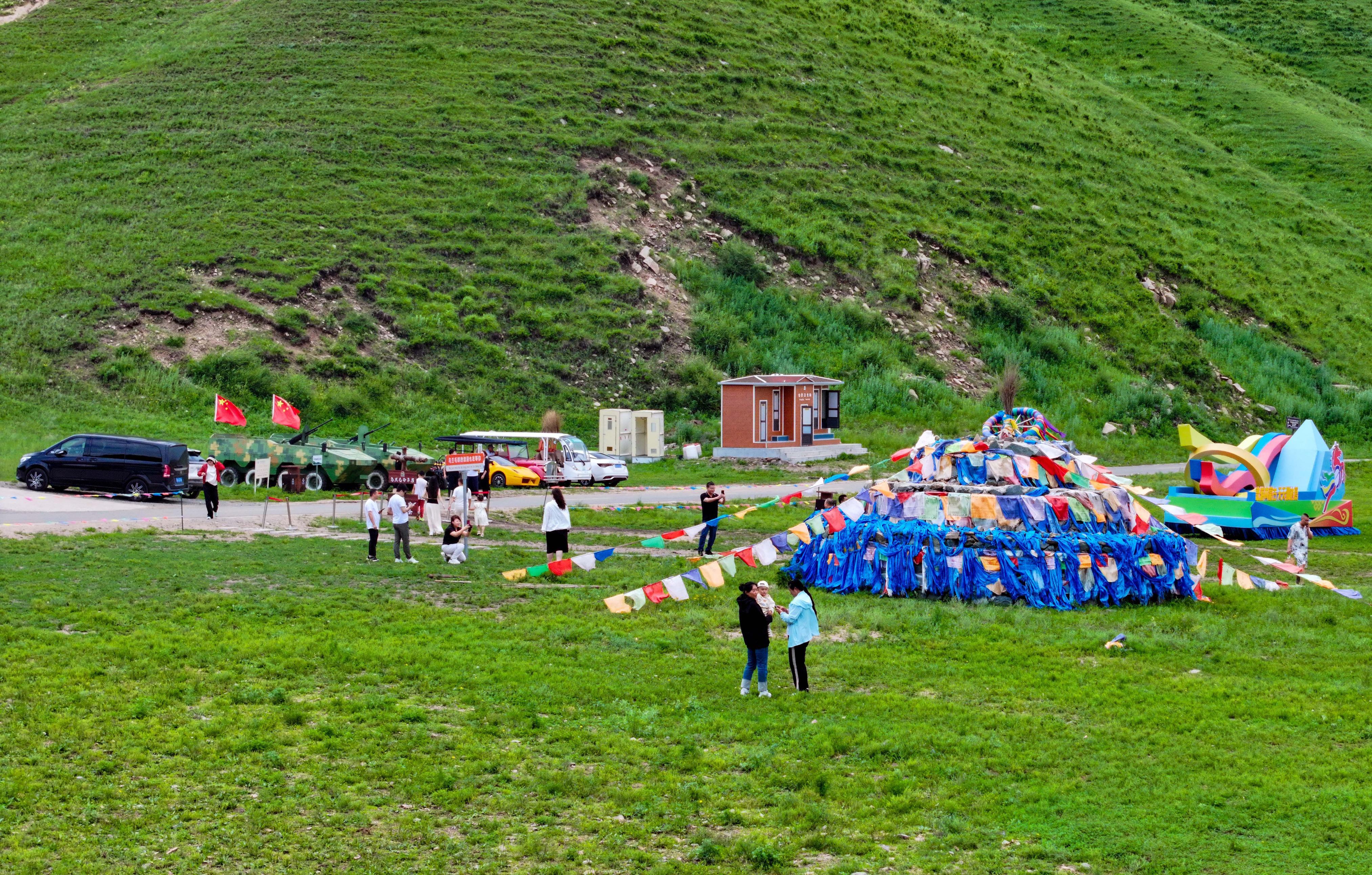 7月8日,遊客在烏蘭毛都草原牧場露營區遊覽(無人機照片)。王正 攝