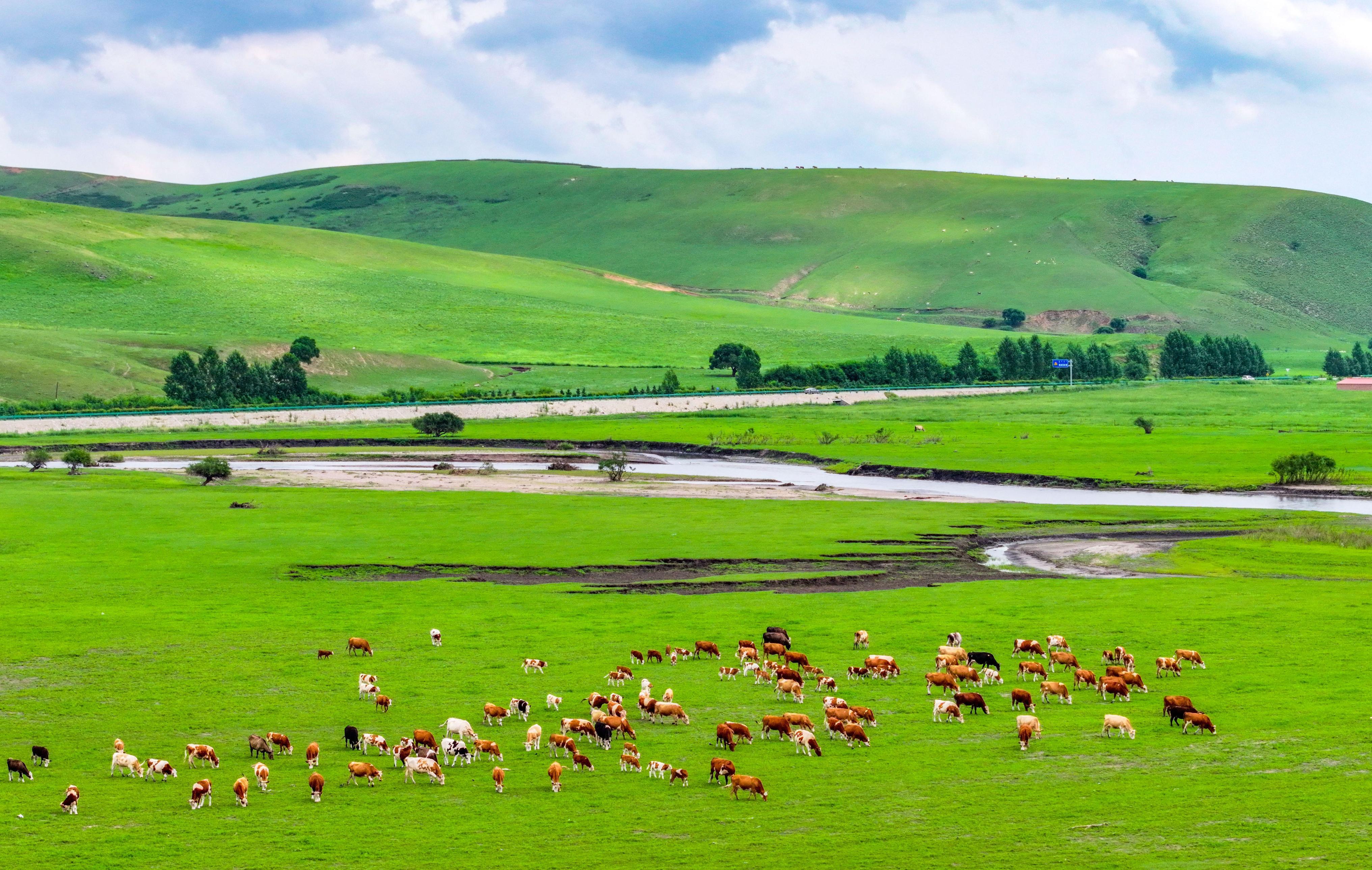 近日,內蒙古自治區興安盟科爾沁右翼前旗烏蘭毛都草原,無邊的碧草鋪向天際,成羣的牛羊悠哉地低頭啃食,吸引着遠道而來的遊客們駐足觀賞。