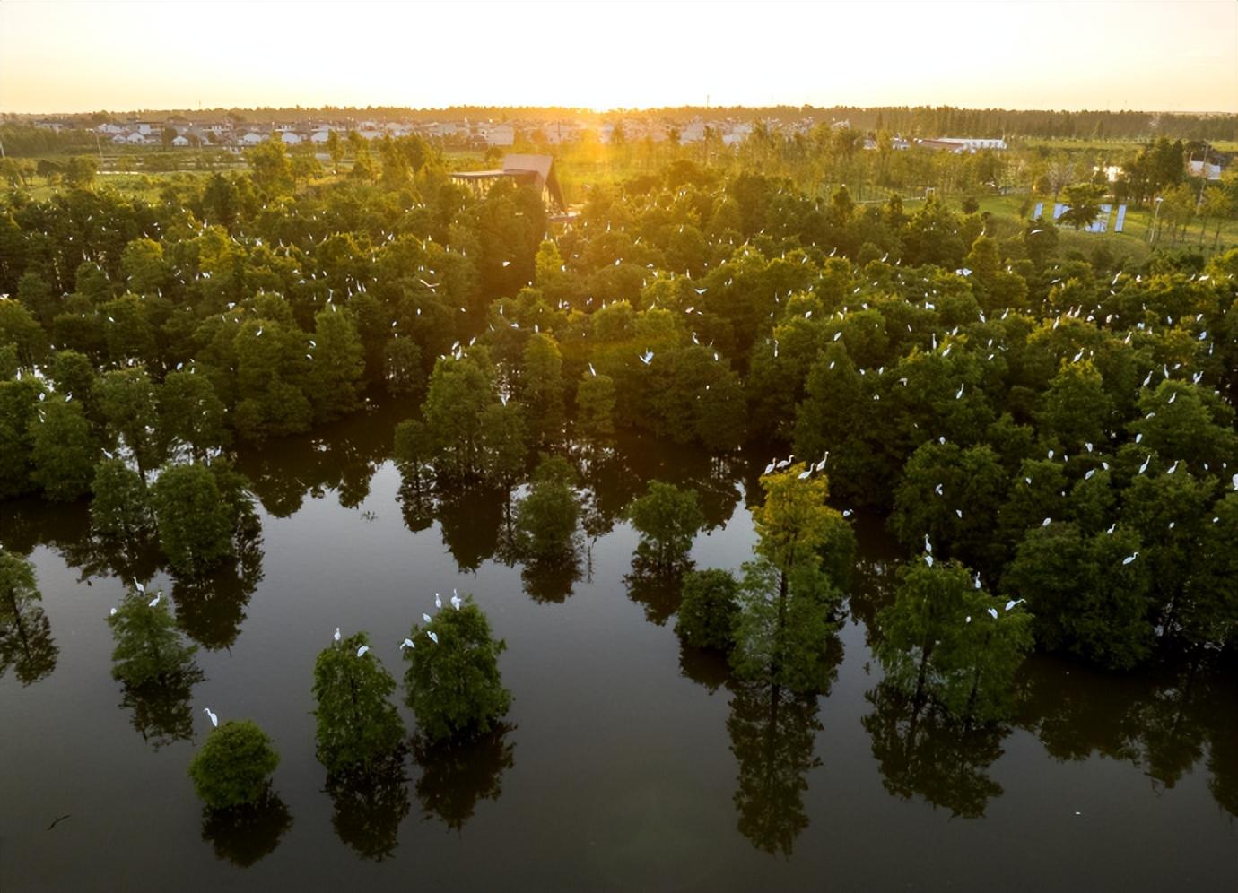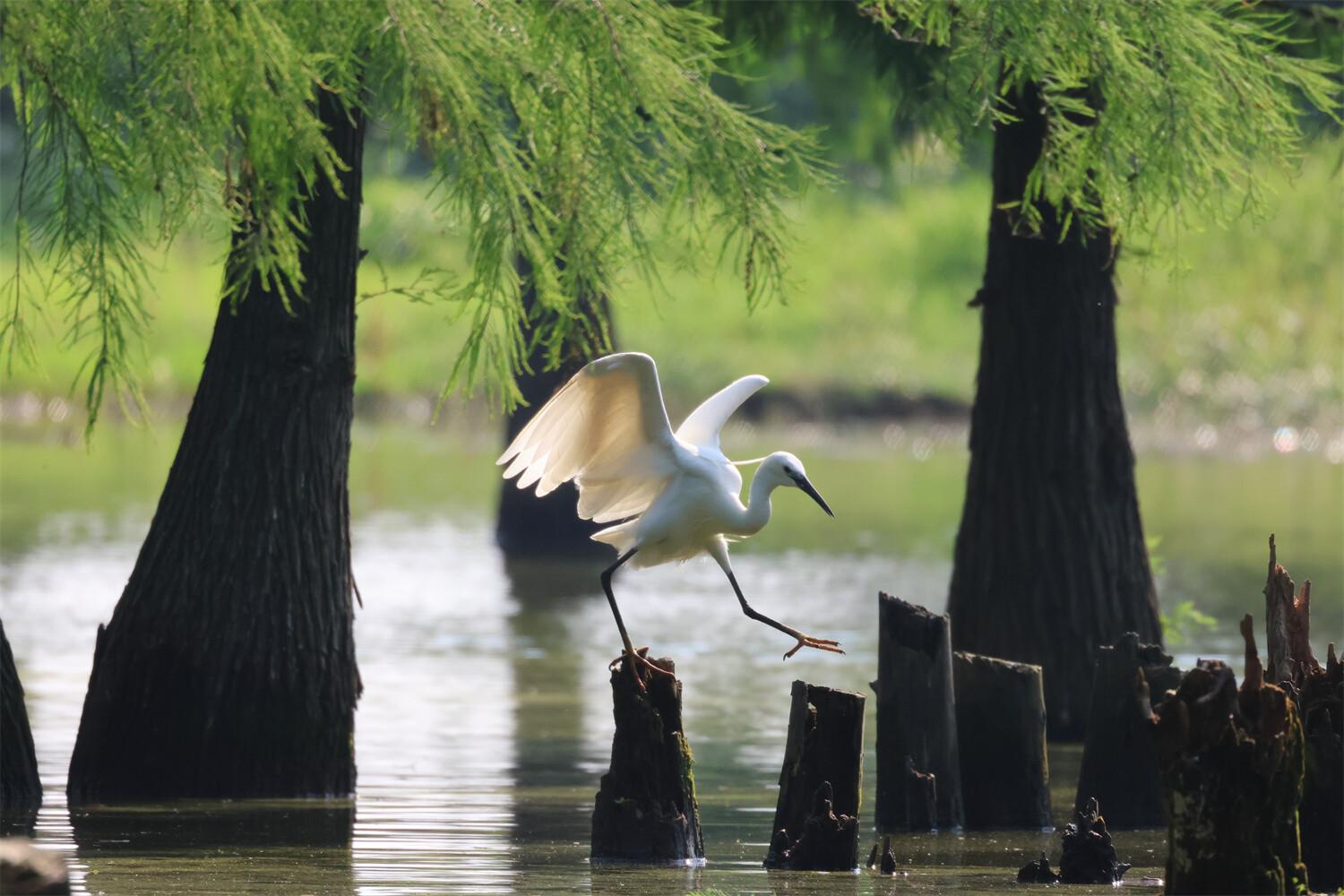 在湖陂村水嵐洲溼地的水杉祕境景點,一大片鬱鬱蔥蔥的池杉矗立水中央,鷺鳥們時不時在林間展翅飛過。岸邊拍照的遊客們輕聲驚歎,生怕自己的聲音會嚇跑鳥兒。