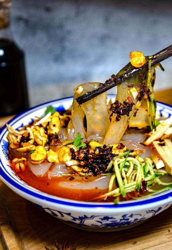 渾源涼粉,大同必喫的清涼小喫,用土豆澱粉、豆腐乾、蠶豆等原料製作而成,酸辣爽口,Q彈爽滑。