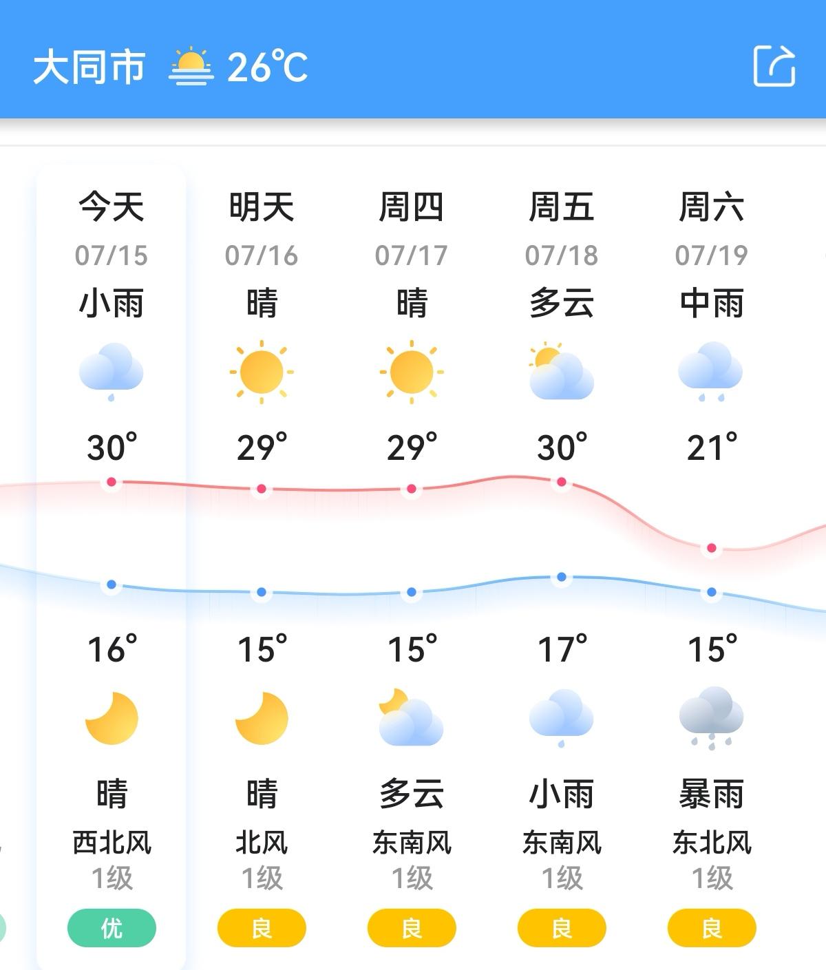 二是晝夜溫差大。大同屬於半乾旱溫帶大陸性氣候,夏季短暫涼爽而且晝夜溫差大,夏天這裏白天高溫在26-28°C,而夜間會降至12-15°C,溫差常達15°C以上,這幾天在周圍城市頻現38度高溫的情況,最高溫度只有30度,晚上睡覺還要蓋薄被。