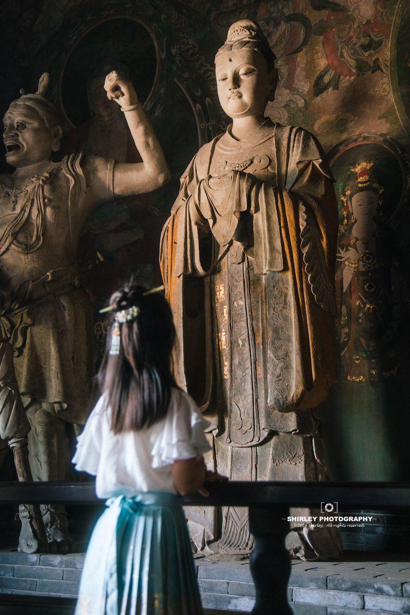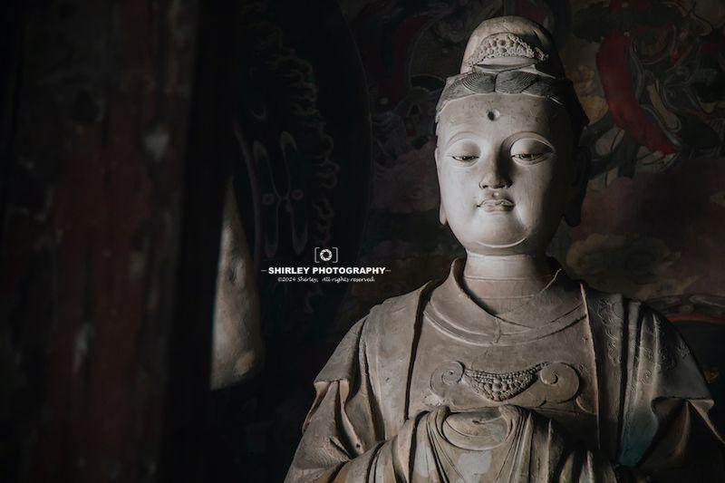 善化寺二十四諸天裏最有代表性的是吉祥天女,造像被古建愛好者稱爲“金代最美彩塑”、“善化寺最美菩薩”。她眼簾微合,眸光柔和似月光傾灑,神情沉靜恬淡,滿目憐憫和慈悲,臉龐上歷代粉刷的痕跡猶如淚痕。她只是安靜地站在那裏,便散發着莊嚴又溫暖的氣息,能讓觀賞者感受到一種超越塵世的力量。