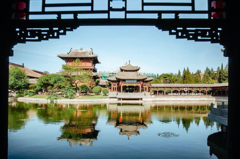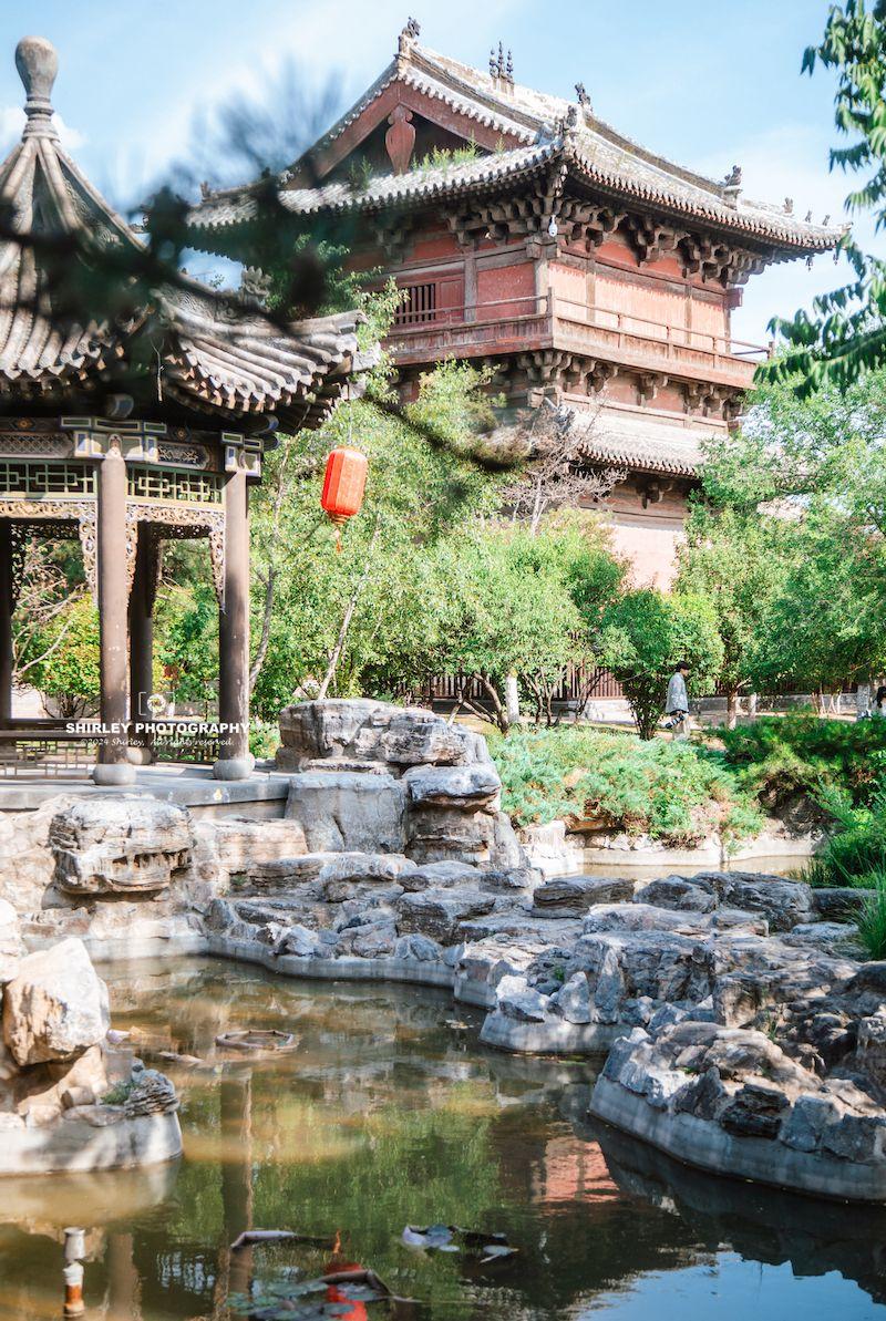 因爲善化寺轉爲收費寺院,原來與之相通的西花園,也關閉了側門,需要從寺外進入。西花園爲免費的仿古園林,步行環繞一圈,可以從另一個角度欣賞善化寺的建築羣。有了水的襯托,顯得善化寺古樸厚重之餘,也更有靈氣了。