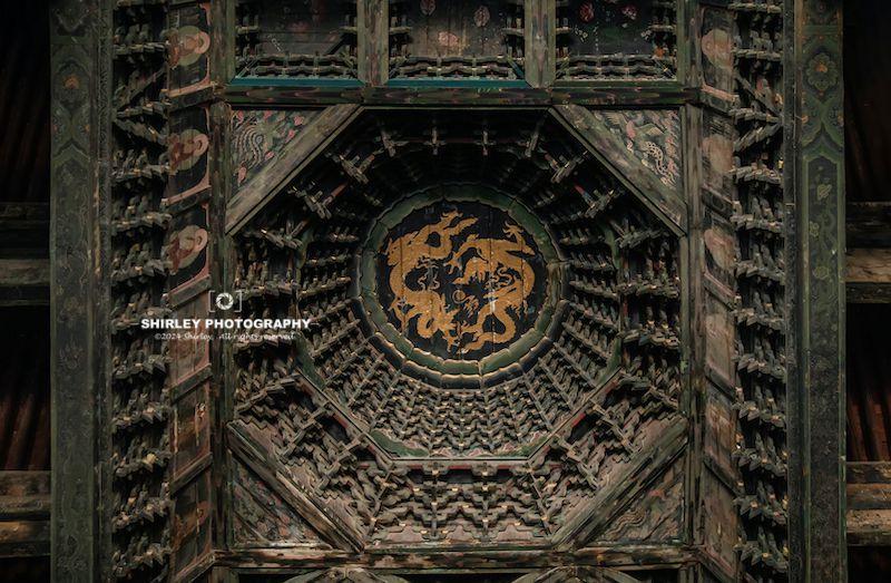 殿內同樣採用減柱法,八根木柱撐起一個宏大的殿堂,除正中間有一塊藻井外,其餘四間都爲徹上露明造,屋頂的梁枋結構一覽無餘。遼人的奔放與坦誠,從中可見一斑。當心間後部設鬥八藻井爲遼代遺構,斗栱繁複細緻,精美絕倫。藻井中心和四角的龍、鳳等紋樣爲明代彩繪。