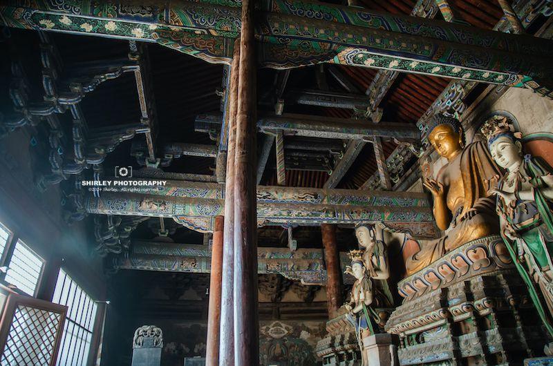 殿內空間開闊,“減柱法”作用之下,4根金代巨柱拓展了殿內的空間,滿足人們禮佛時的空間需求、減少柱列對視線的影響。“減柱法”與“移柱法”一樣,是遼金時期建築設計施工中的創新。