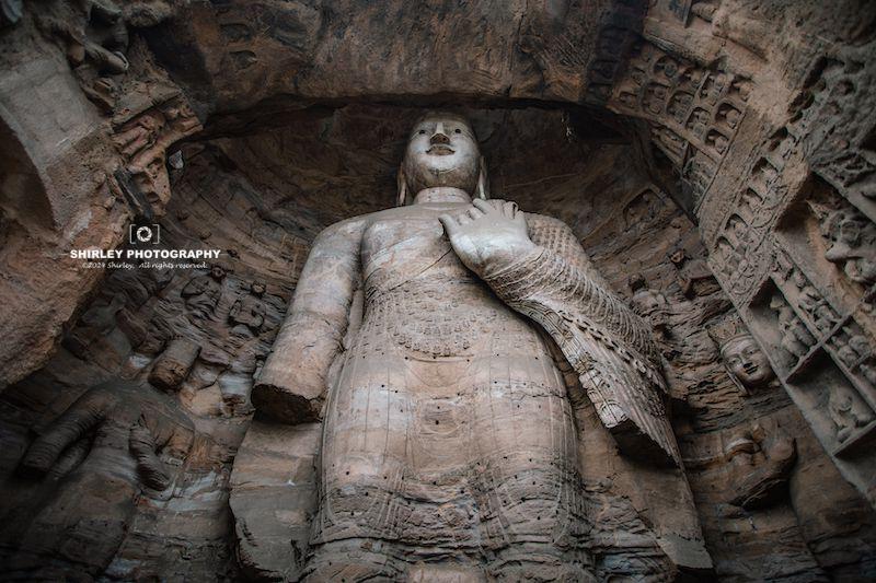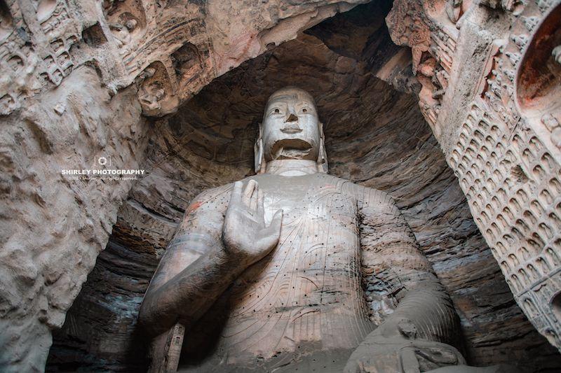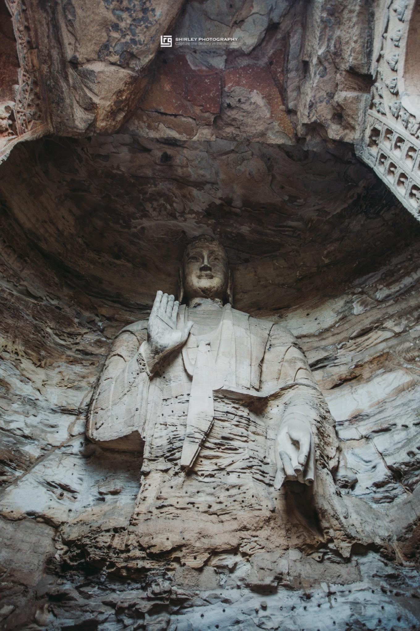 20窟是雲岡石窟的標誌,因前壁坍塌成爲露天造像,高13.7米。作爲五萬多尊佛像的代表,他不辭辛苦地接待着絡繹不絕的中外遊人,在雲岡的地位相當於盧舍那之於龍門石窟。