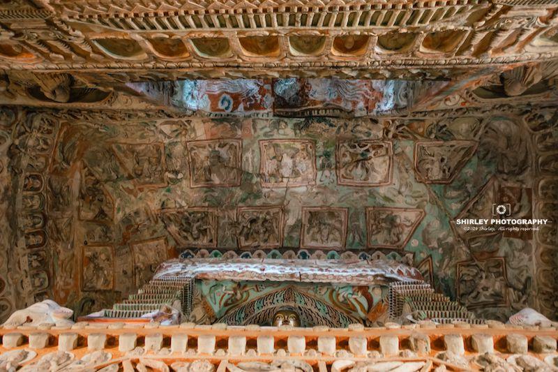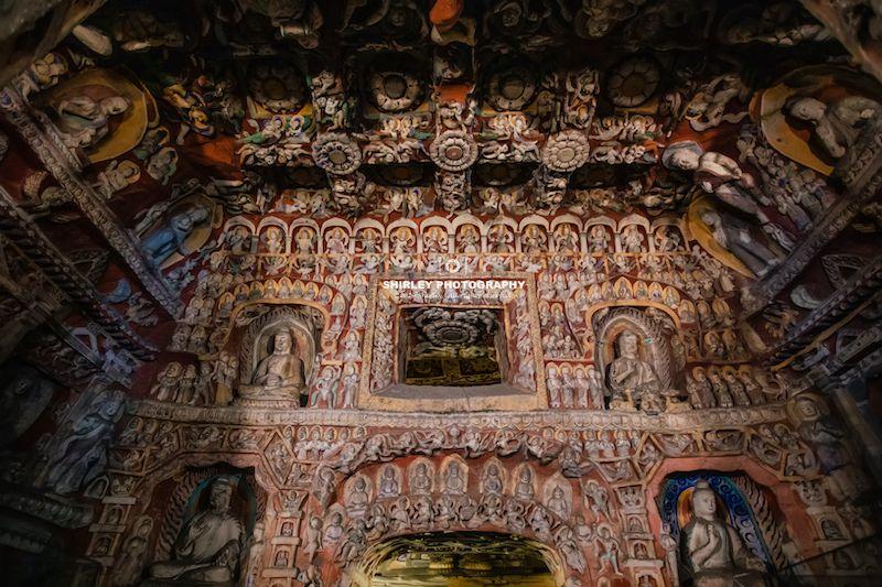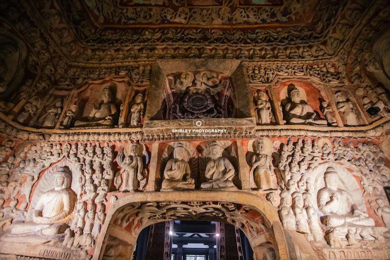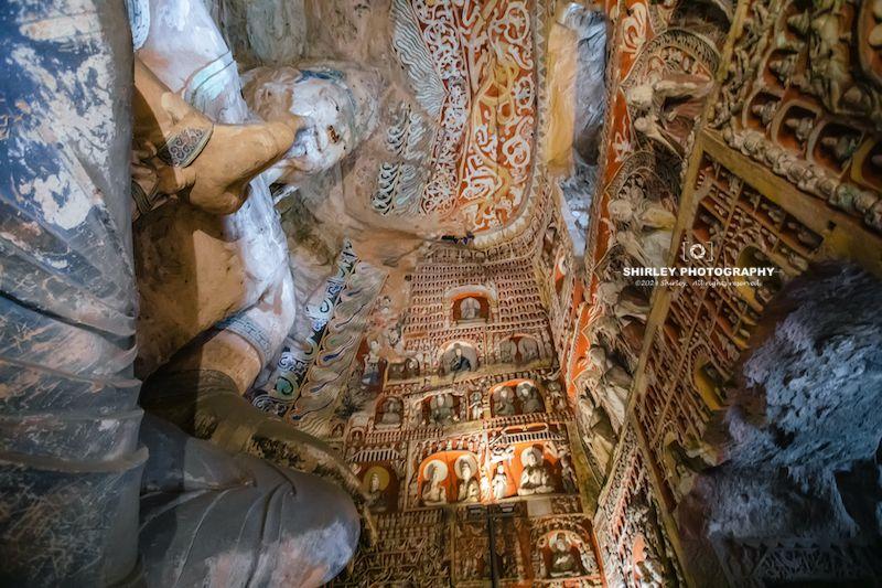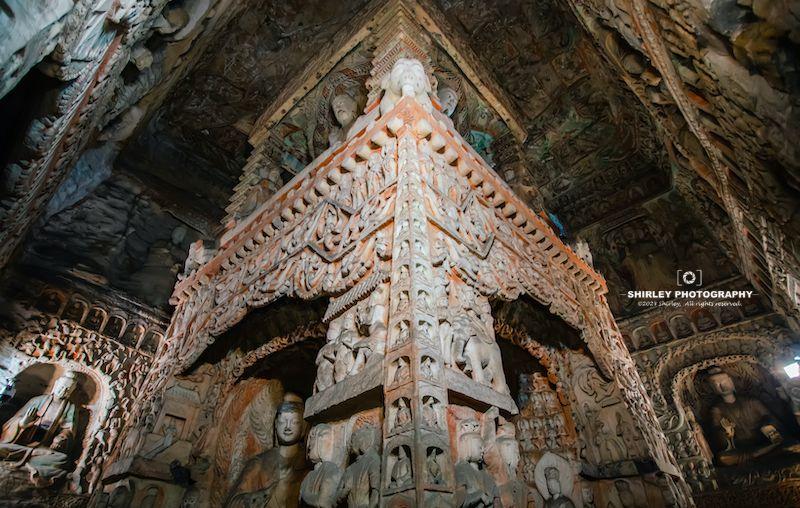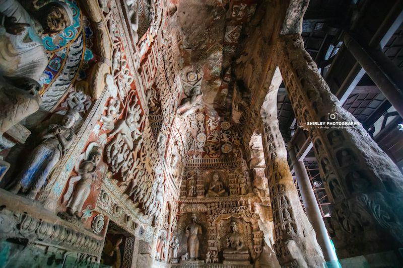 第6窟是雲崗故事最豐富的“第一偉窟”,中心塔柱窟,內飾雕塑被稱雲岡之最。窟內四壁上層環列立佛十一尊,華蓋承懸,氣宇軒昂;窟頂格間可以看見騎乘孔雀、獅子、虎、長尾鳥等動物的多臂多首天神。偌大的空間內,竟然找不到一處留白,共同組成了一座熱鬧擁擠、琳琅滿目的佛國世界。