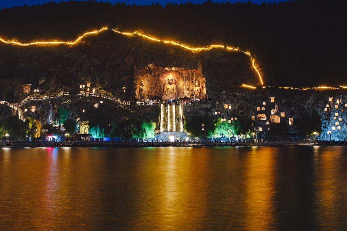 不過龍門石窟有個殺手鐧(四大石窟裏其他三個沒有),那就是龍門的夜景。走到流光溢彩的伊水河對岸,華燈初上時一盞盞太陽能燈漸次點亮每個洞窟,如無數繁星斗然降落人間。目睹此景,恍惚之間好似回到了一千多年前的龍門,當時又名神都的洛陽。