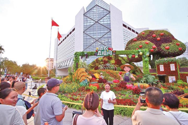 “鄉村振興”花壇的“助農直播間”吸引了不少遊客