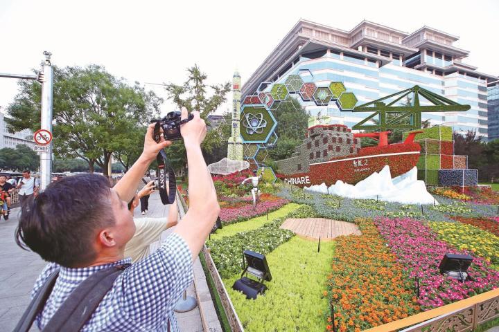 遊客舉起相機,拍下“科技強國”花壇全貌