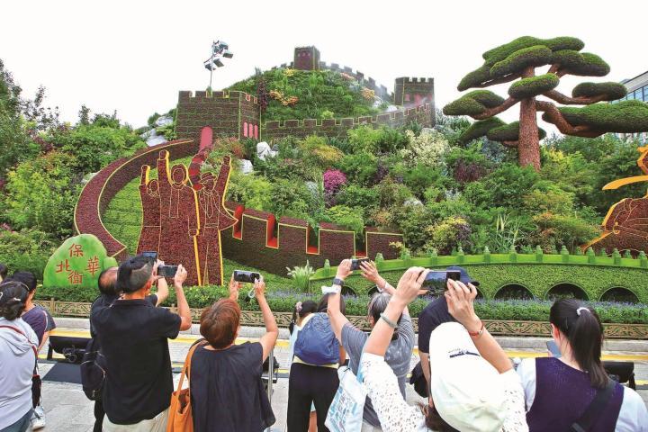 “衆志成城”花壇前,巍峨的萬里長城景象被記錄在市民遊客的相機裏