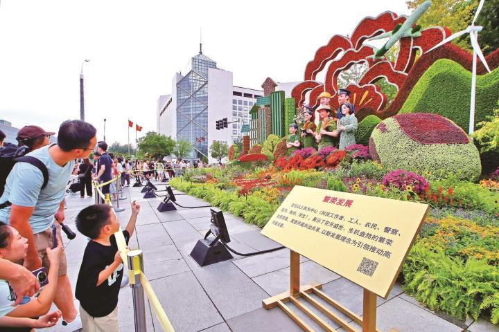 從建國門到復興門,十組主題花壇既展現了中國人民抗日戰爭時期的艱苦卓絕、衆志成城,也描繪了新時代國家日新月異的發展以及人民美好生活的場景。東側五組花壇展現了中華民族英勇無畏、可歌可泣的偉大勝利,西側五組花壇展現了新時代偉大成就,共同營造莊重熱烈的氛圍。