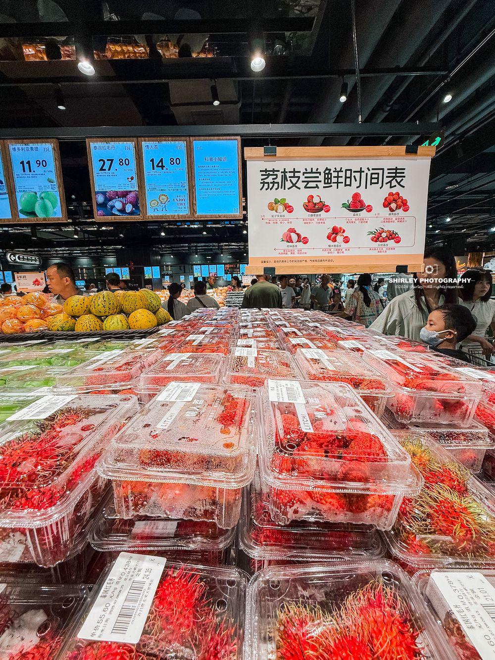 超市入口處,除了常見的購物籃、購物車,還擺着兒童推車和老人助行器,推車把手都用軟布包着;走到生鮮區,相關食材邊上,各種菜譜卡片可以帶回家,增加做飯靈感;在水果區賣荔枝的地方,超市幫忙總結了不同種類荔枝的嚐鮮表;在結賬區外面,就是洗手區和微波爐櫃檯,如果有立刻要喫的食物,可以馬上加熱。