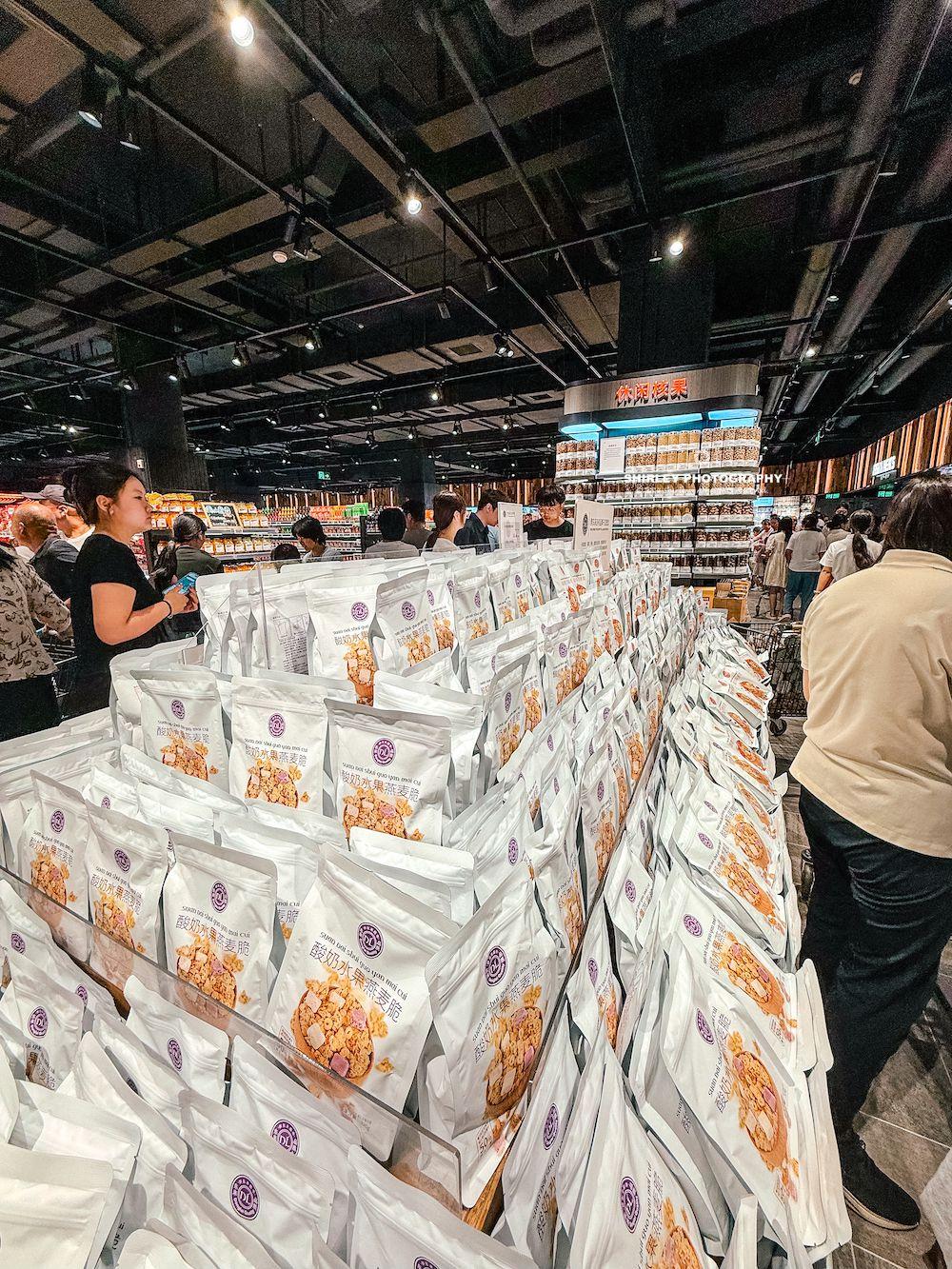 最最最熱鬧或者說恐怖的是超市的烘焙區,一大半商品都是網紅,價格都不貴。由於烘焙食物的特性,現做現賣因此製作時間比較長,需要等待。往往一出爐上架,就被一搶而空,問工作人員XX蛋糕怎麼沒了?回答都是2小時以後、3小時以後再過來看。我們沒法等幾個小時,因此有什麼拿什麼,後來品嚐了發現味道並沒有太驚豔,就是普通烘焙食品的水準。建議大家還是理性消費,真心不至於花幾小時去等待。