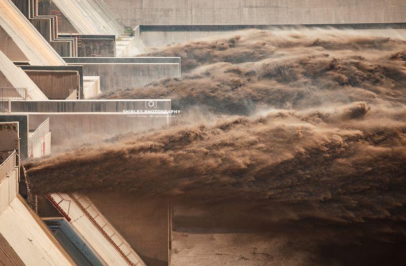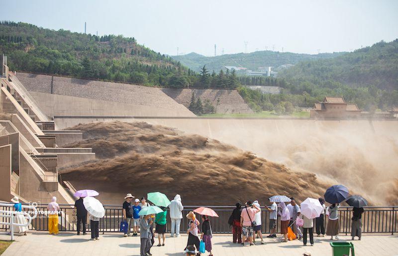 遊客可以沿着步道一路走到大壩邊上,當排沙洞開啓黃河水裹挾着大量泥沙洶湧而出,便可近距離感受黃河如黃龍騰空而起,翻滾搏殺,掀起排排巨浪又瞬時化爲雲煙,咆哮着直向下遊衝去。哪怕是世界上最震撼的瀑布,此時與之相比都會顯得遜色。另外,排沙期間河水爲泥土一樣的黃色,因此仔細看每一朵奔湧的浪花最前端都像一隻金獅的臉龐,令人不可思議。