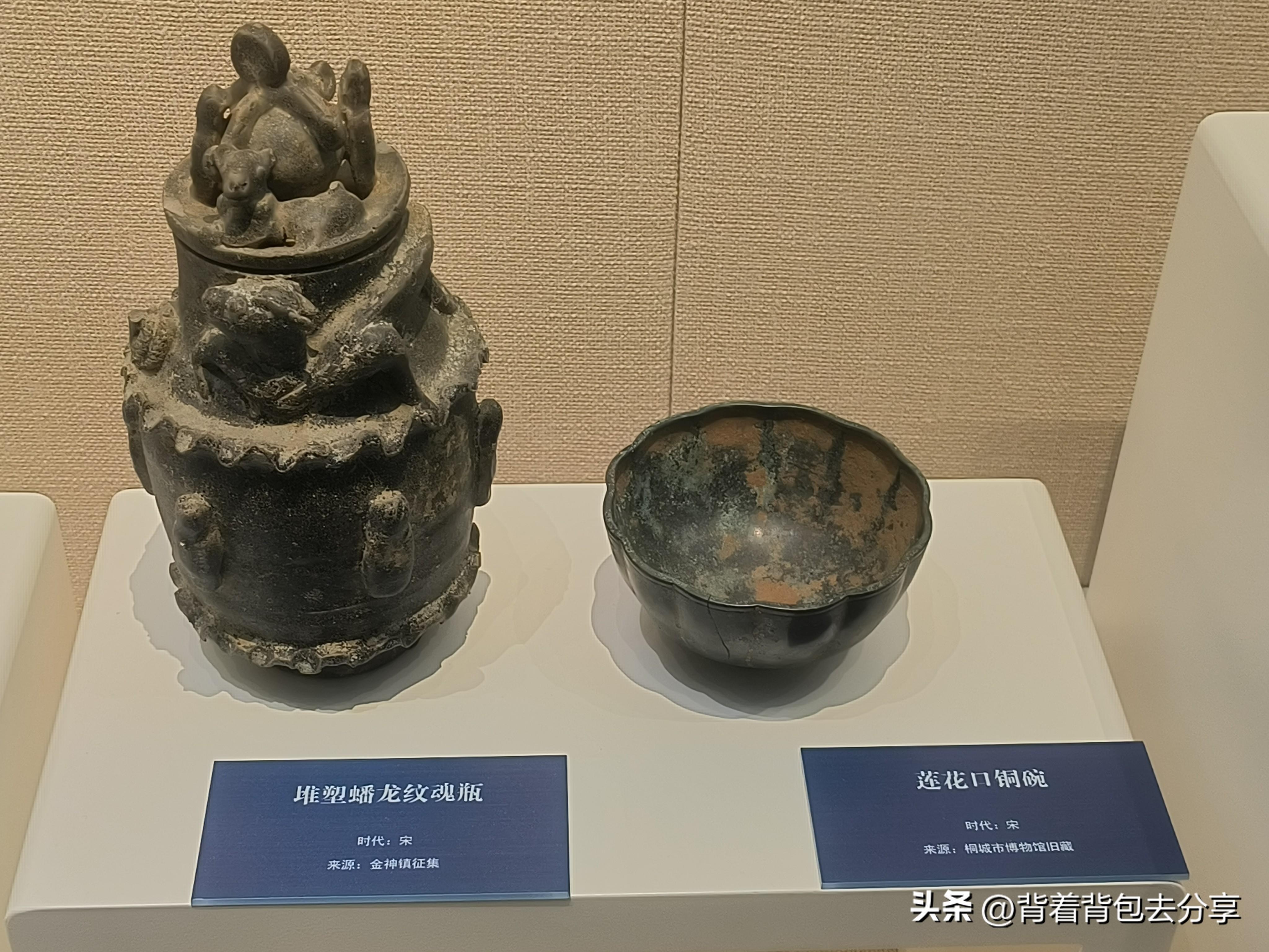 第一部分古邑春秋名城遺韻,鎮館之寶春秋青銅獸耳尊,國家一級文物,是博物館必打卡的文物之一,也是進入博物館最顯眼的位置,這件青銅尊歷經兩千多年風雨,依舊保持着其原有的風采,見證了桐城深厚的歷史底蘊,更展現了江淮地區青銅時代的禮樂文明,除了青銅尊,還有戰國青銅戈-西晉虎子-六朝蓮社尊-唐代銅鏡-明代東瓜罐等