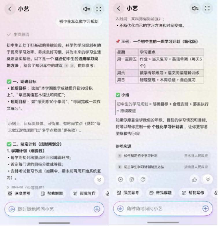 就說學習生活這塊,小藝就是我的貼心小助手。初中生怎麼做學業規劃、讀哪些課外讀物,甚至如何培養良好的生活和學習習慣,小藝都能給出超實用的建議,就像有個專屬顧問在身邊。