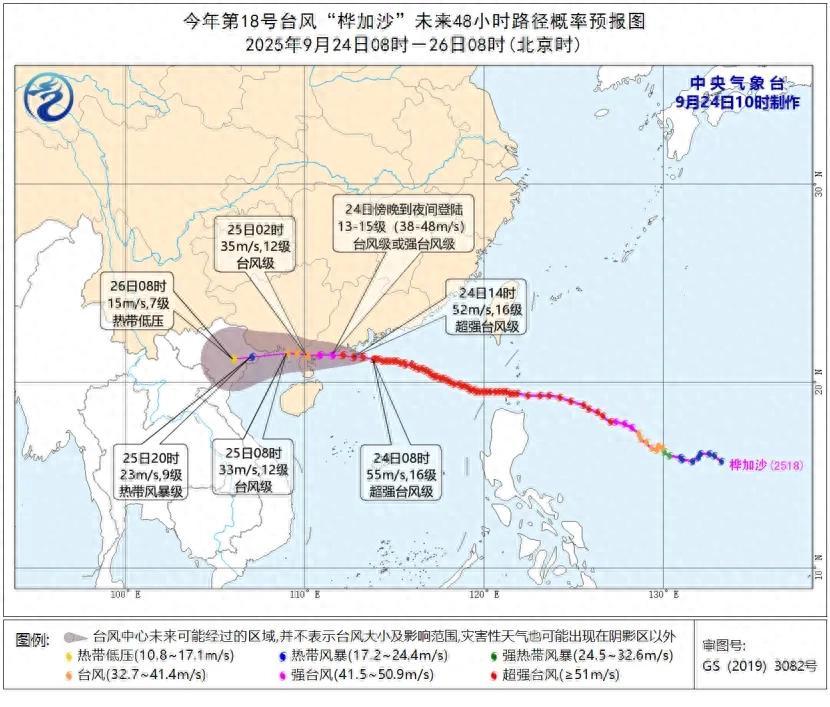 大風預報:24日14時至25日14時,廣東中西部沿海、廣西沿海和南海北部的部分海域或地區風力有10-13級、陣風14-15級,颱風中心經過的附近海域或地區風力可達14-16級、陣風17級以上。