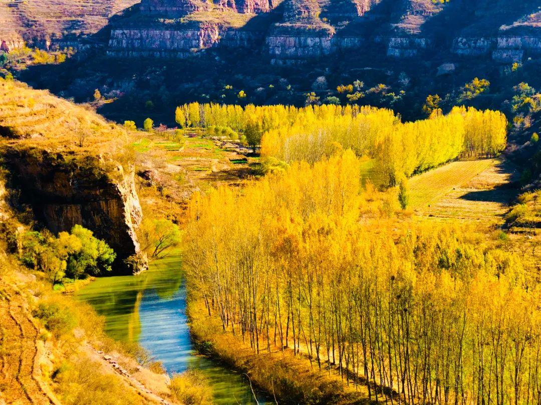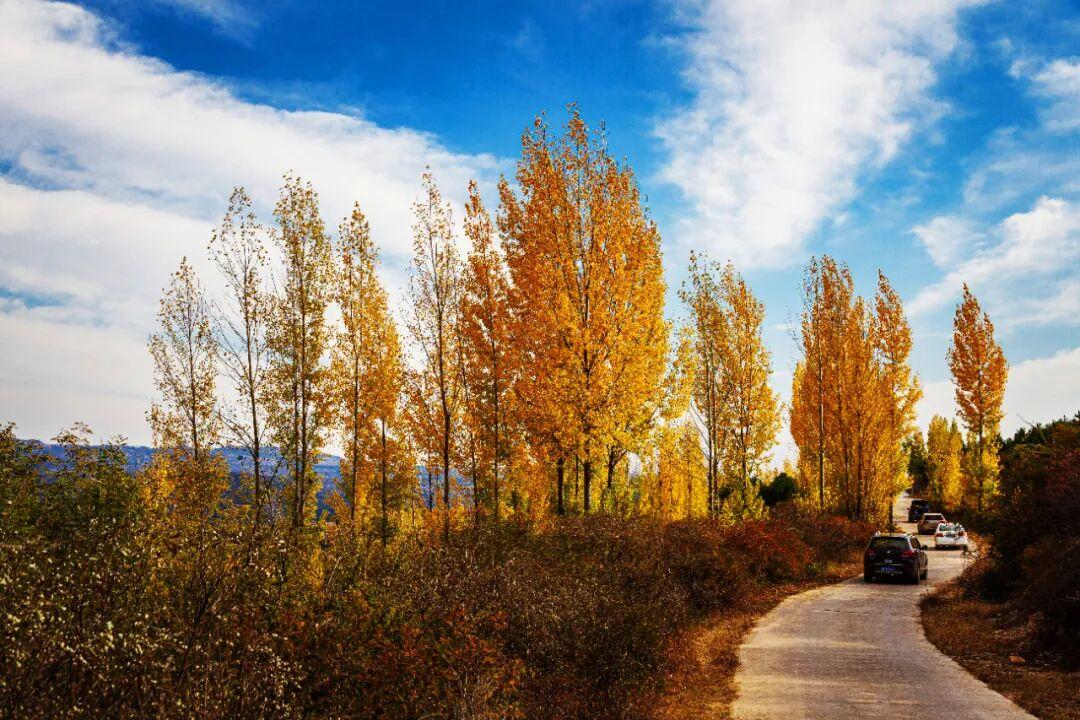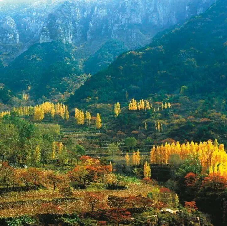 秋季的南太行猶如打翻的顏料桶一一藍天、白雲、黃色的楊樹葉、黃櫨、紅楓……