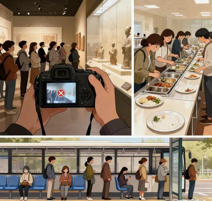 若計劃出境遊,更要提前做功課,多瞭解當地文化習俗與禮儀規範。在博物館等場所參觀時,保持安靜、避免喧譁,拍照前關閉閃光燈,不隨意觸碰展品;乘坐公共交通工具時,自覺排隊、不搶佔座位,不將隨身物品放置鄰座;享用自助餐時,遵循“少量多次”原則,按需取餐避免浪費;在歐美等有小費文化的國家,按當地慣例給服務人員合理小費;不攜帶瀕危動植物製品、違禁藥品等物品。