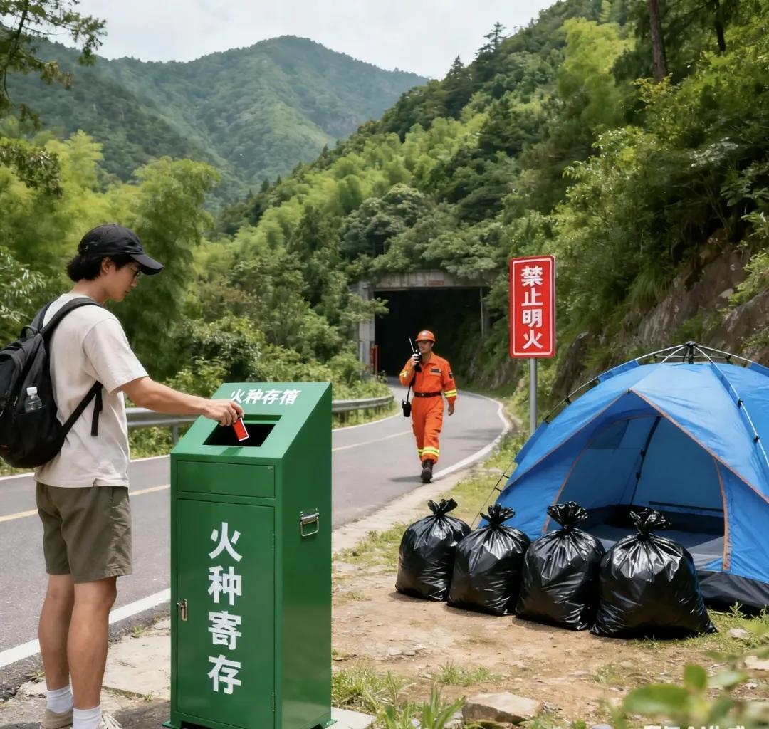 進林區前,主動配合工作人員防火檢查,將打火機、電子煙等火種暫時寄存;在林區內擅自搭建燒烤架生火、隨意丟棄未熄滅的菸頭,極易引燃植被,不僅破壞生態環境,還可能構成犯罪;野外露營請選擇景區指定營地,離開時把垃圾、裝備全部打包帶走,不遺留任何“尾巴”。這些細小舉動,都是守護綠水青山的重要防線。