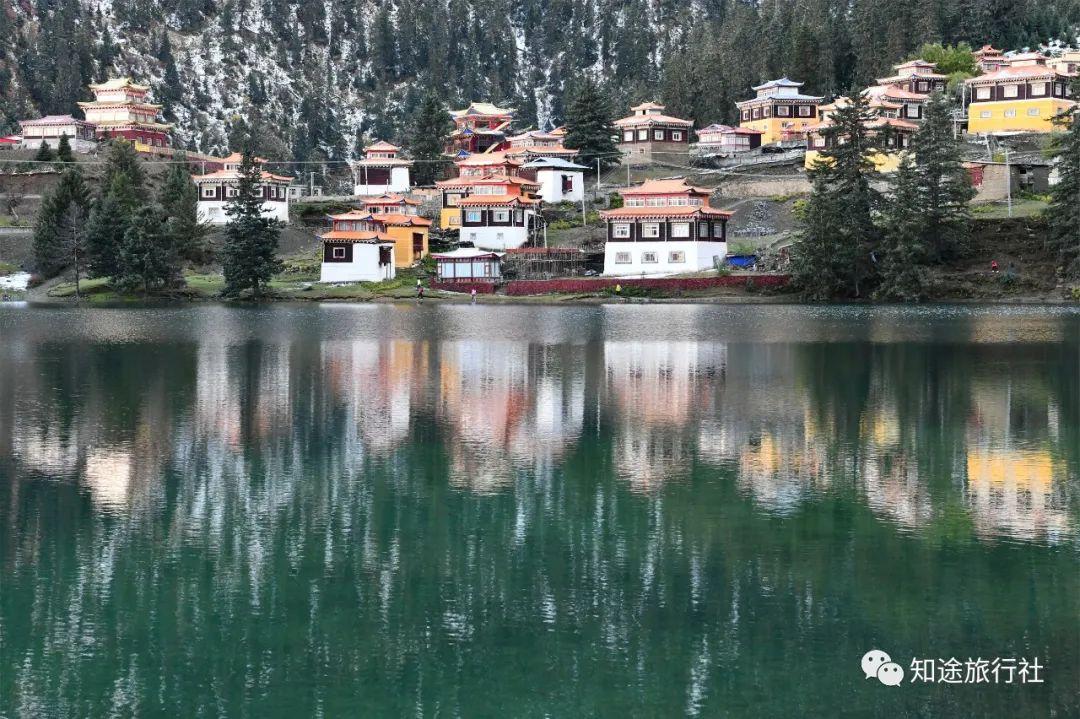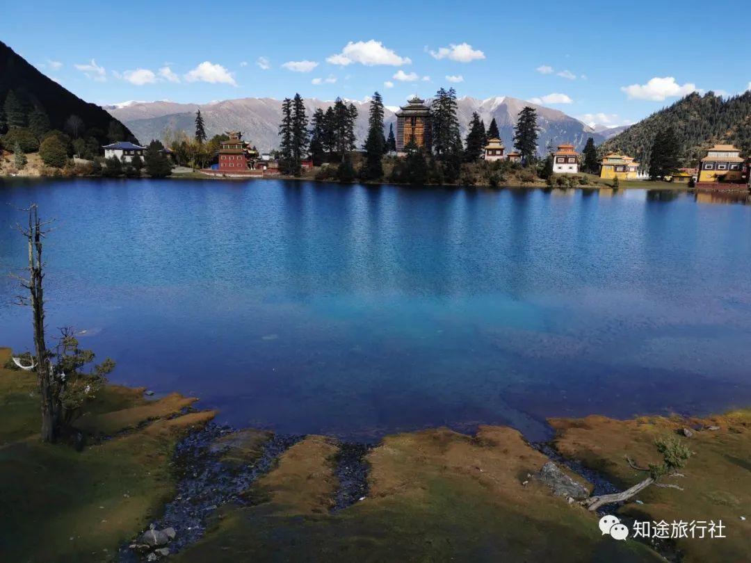 這個面積只有3平方公里、環湖一圈花不了1小時的淡水小湖,沿湖錯落分佈着高大的樹木、寺院、藏式民居建築、靈動的魚兒,走着走着,你只想停下來。