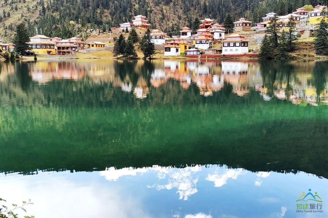 森林的墨綠,草甸的青綠,寺院建築的藏紅、橙黃、奶白、金頂,與藍天白雲倒影在湖中,豐富細膩的色彩變化,像極了印象派油畫。