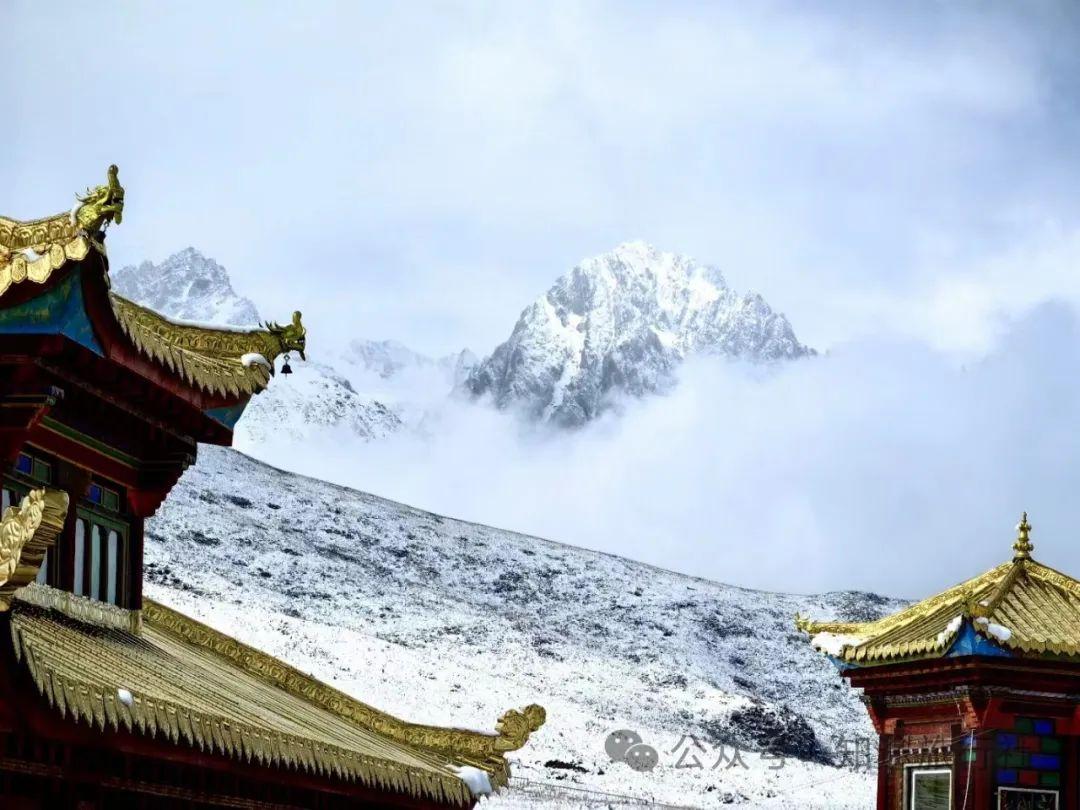 草原之上是一座金光閃耀的寺院,寺院背後是極爲雄壯的雅拉神山雪峯。
