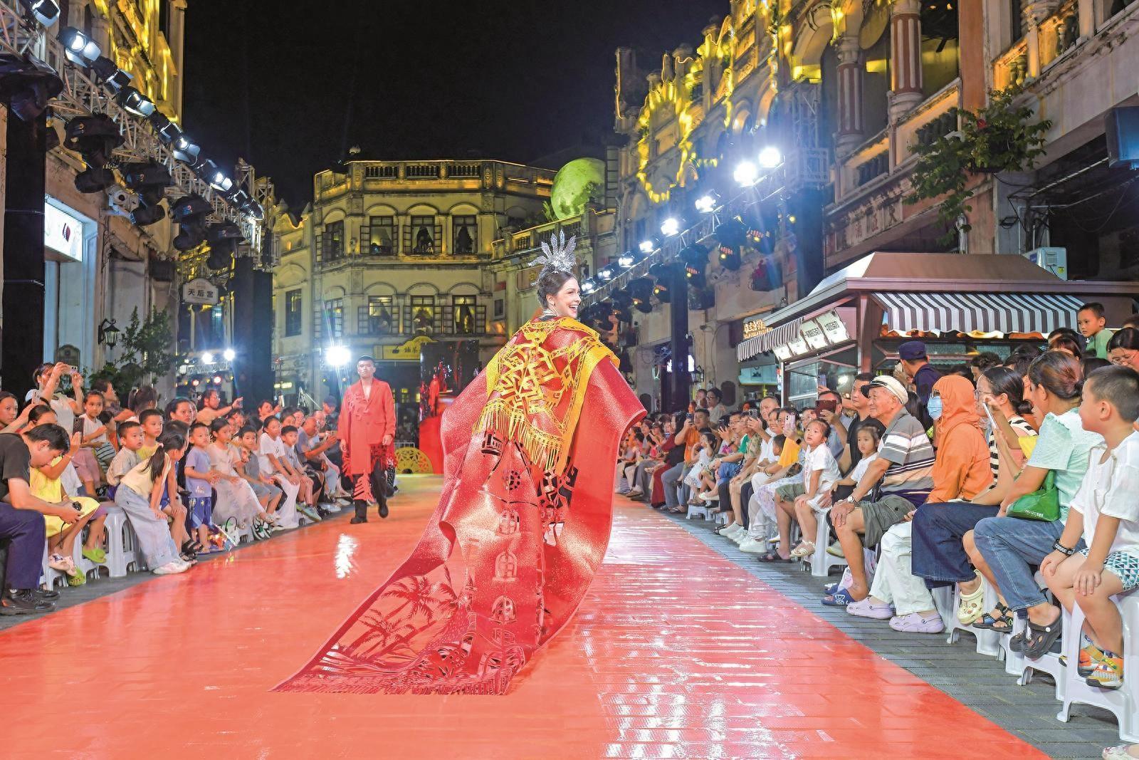 10月7日晚,錦色·2025非遺潮秀在海口騎樓老街上演,吸引了衆多假日裏的遊客。 中新社記者 駱雲飛 攝