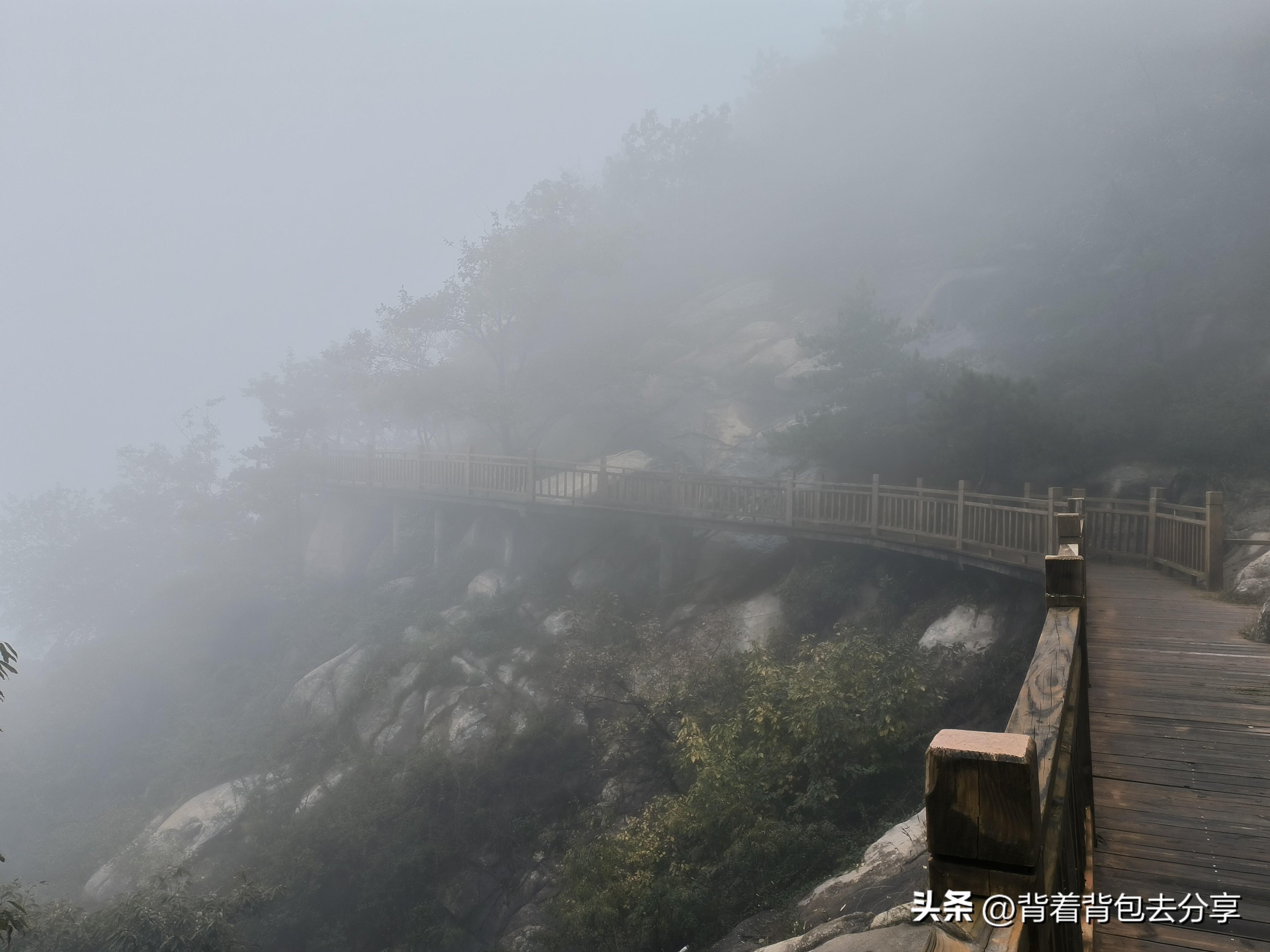 聖母殿是一處分叉口,一處通往北天門,一處通往玻璃棧道,而我們選擇西路下山,從這裏開始,正式進入西線道路,此時,只能看到近觀建築,遠處的景觀,能見度極低,全被雲霧遮擋