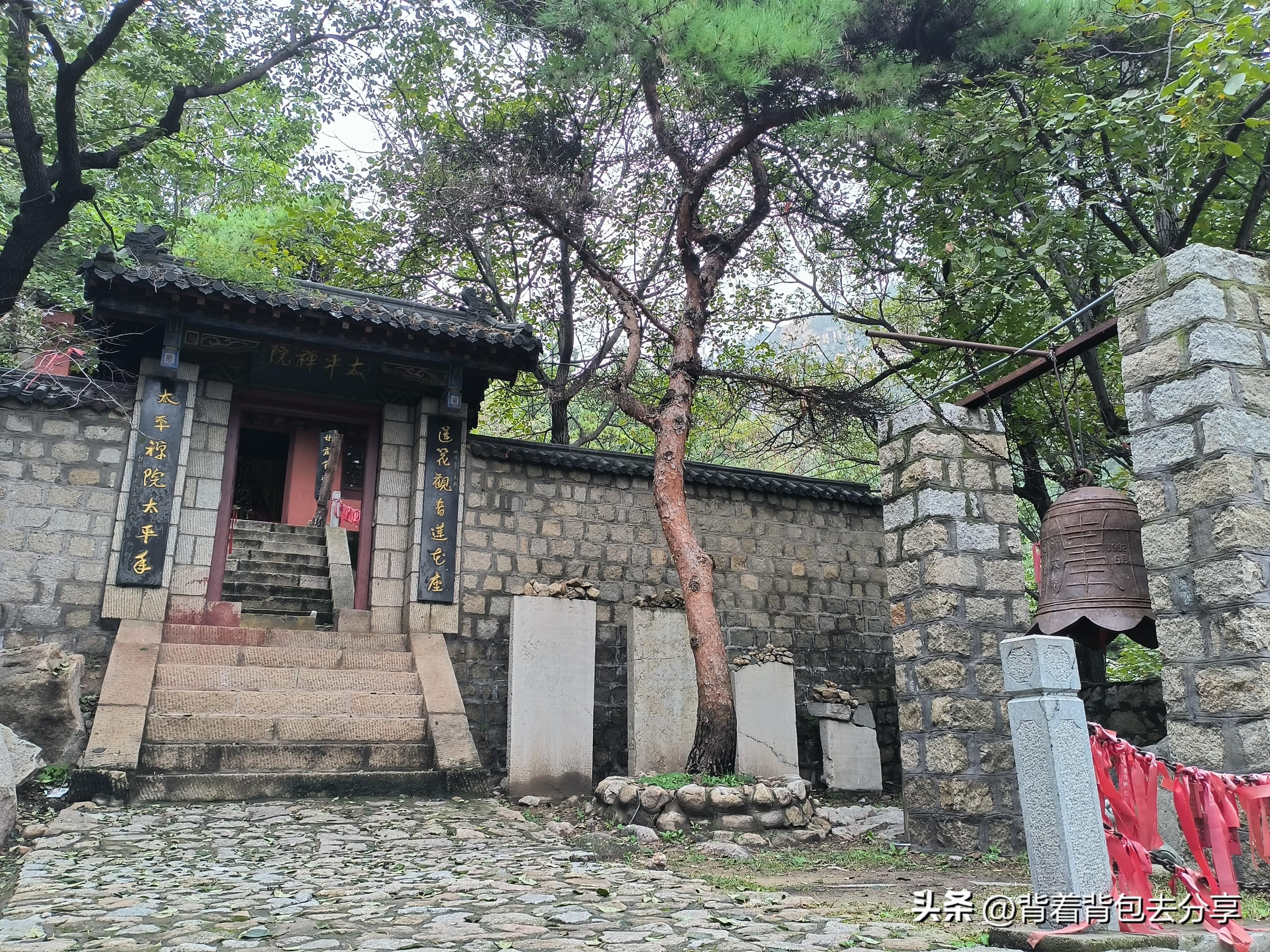 太平禪院原爲太平庵, 創修於明朝嘉靖三十五年,清朝雍正元年和十一年曾兩次重修,後因故荒廢, 2005年重修後對外開放,有正殿三間,坐北面南,殿內供奉觀世音菩薩,對面一側是黑龍瀑,這裏風景絕佳,在瀑布的上下間,都有遮陽傘與座椅,兩個小孩來到瀑布中間,我便拿出手機,相繼爲兩個小孩拍照打卡