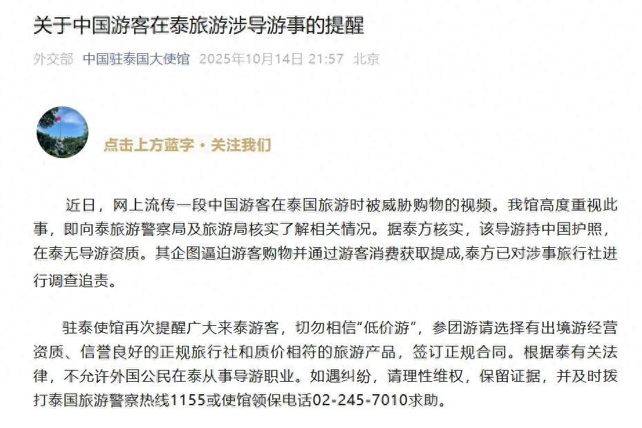 10月14日,中國駐泰國大使館發佈關於中國遊客在泰旅遊被威脅購物的提醒: