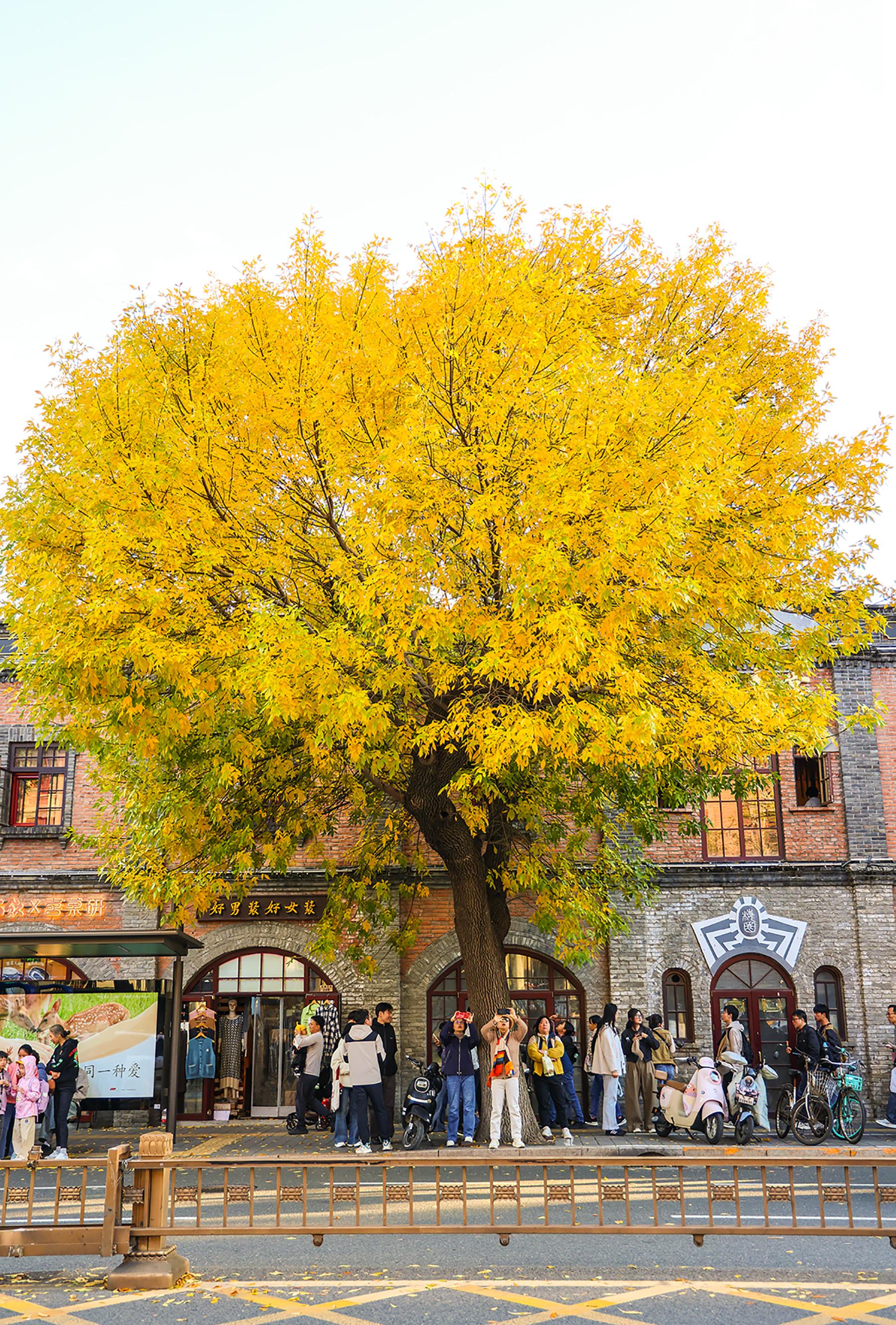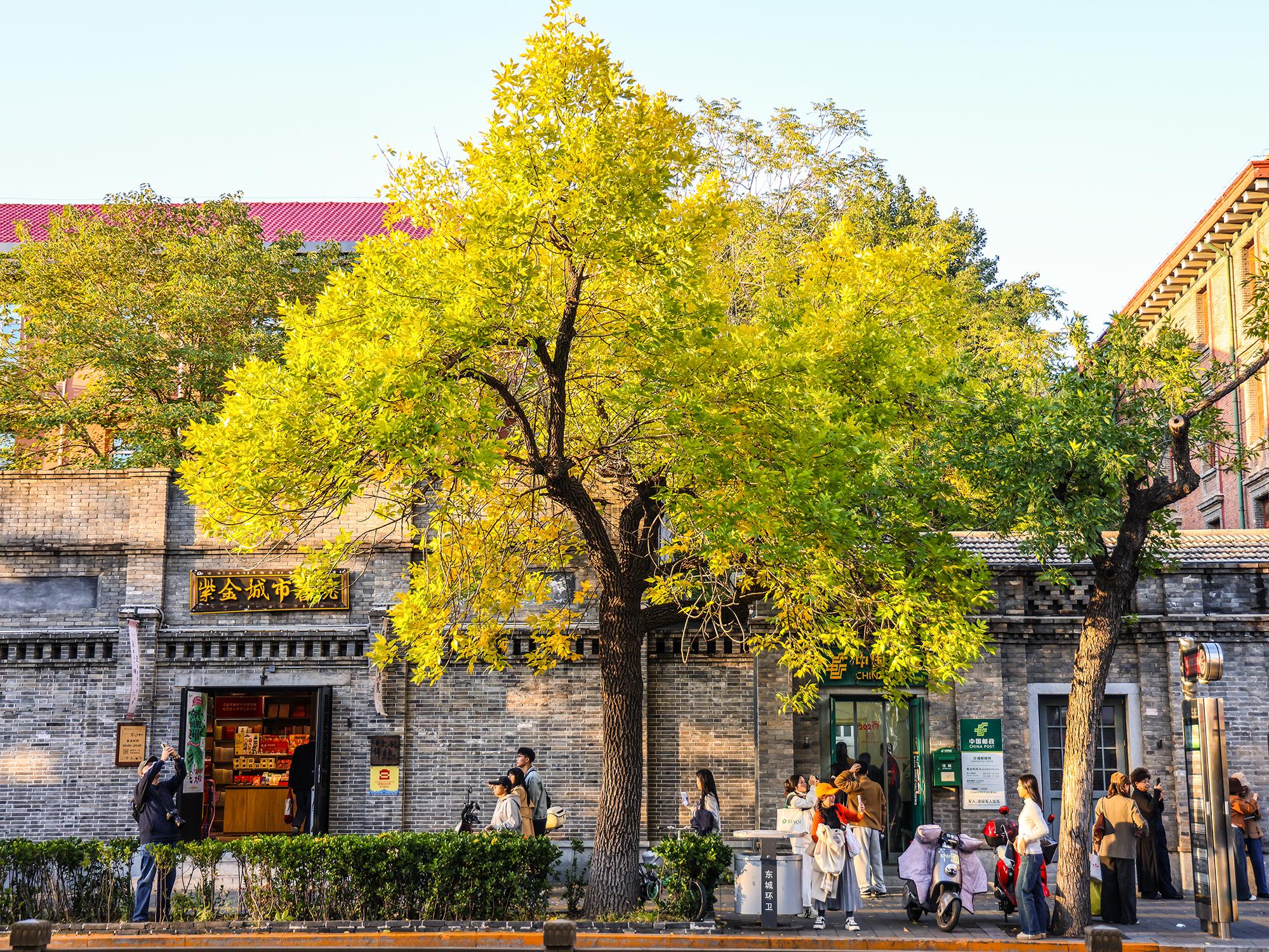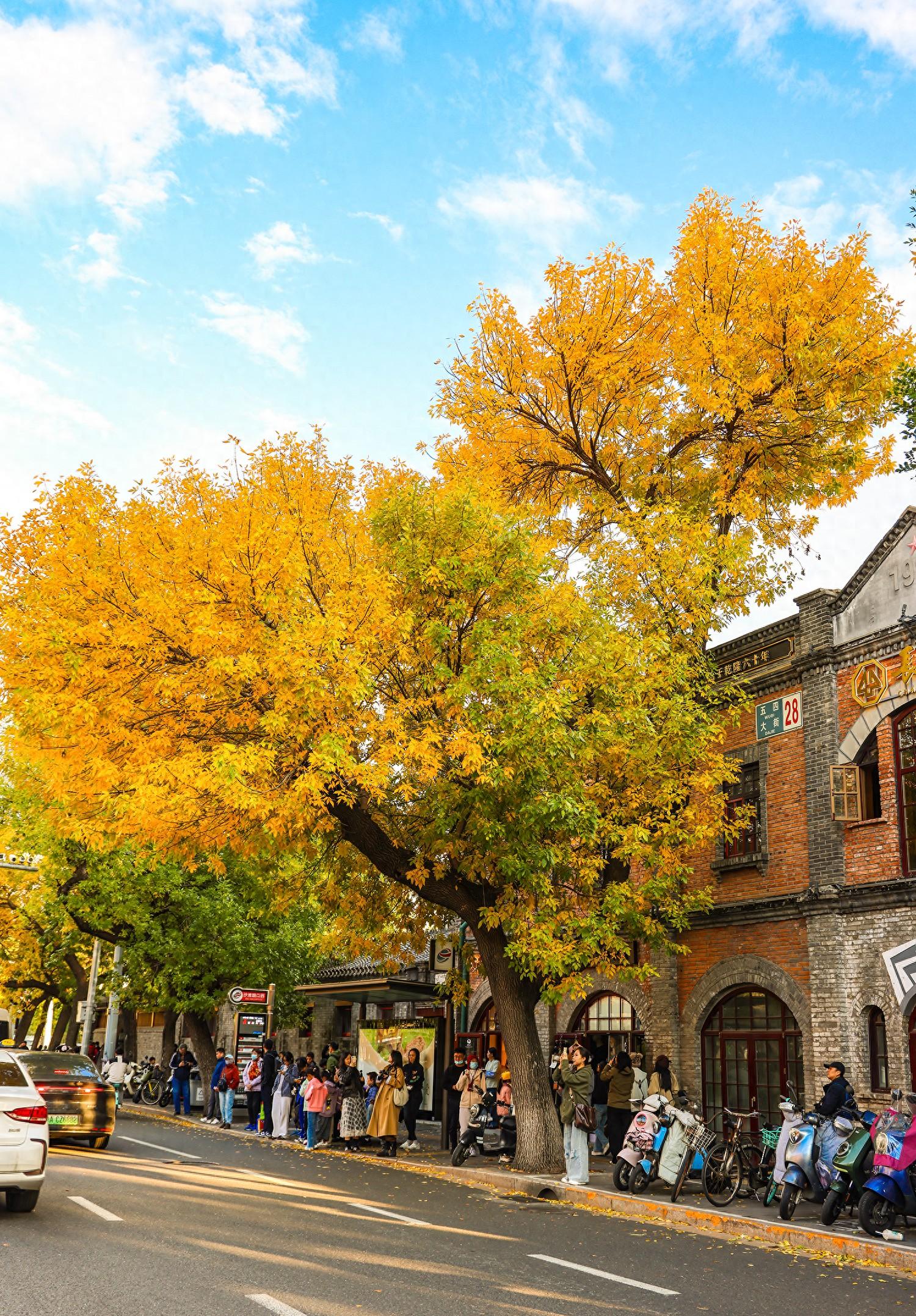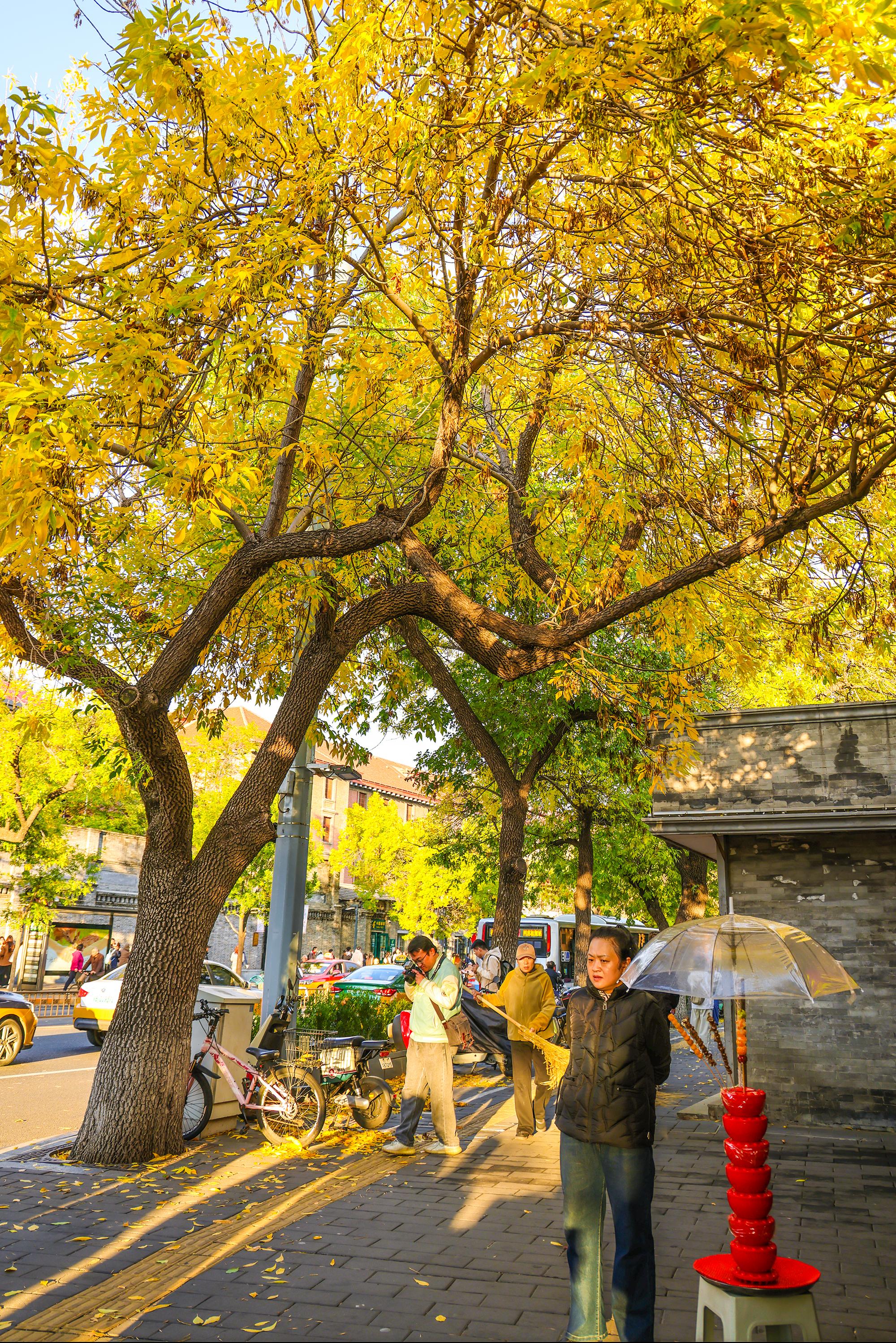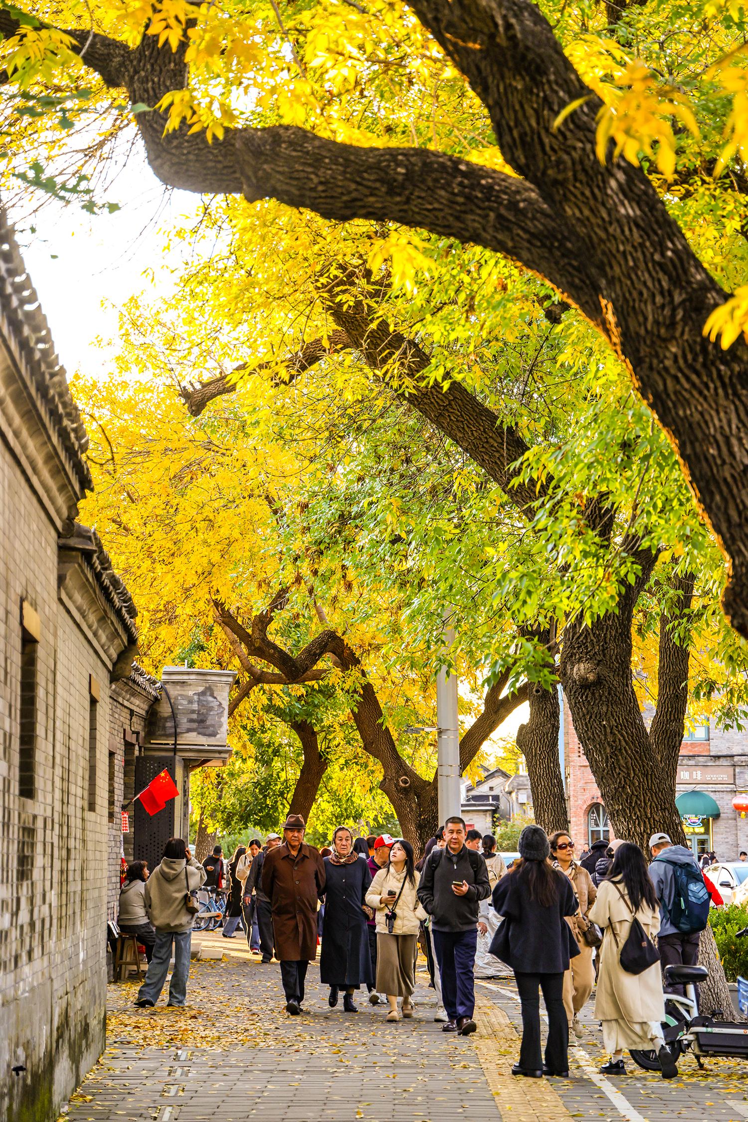 10月17日,北京五四大街秋意漸濃,沿街不少白蠟樹褪去綠衣、披上了金色“秋裝”,吸引了衆多市民、遊客前來賞秋。