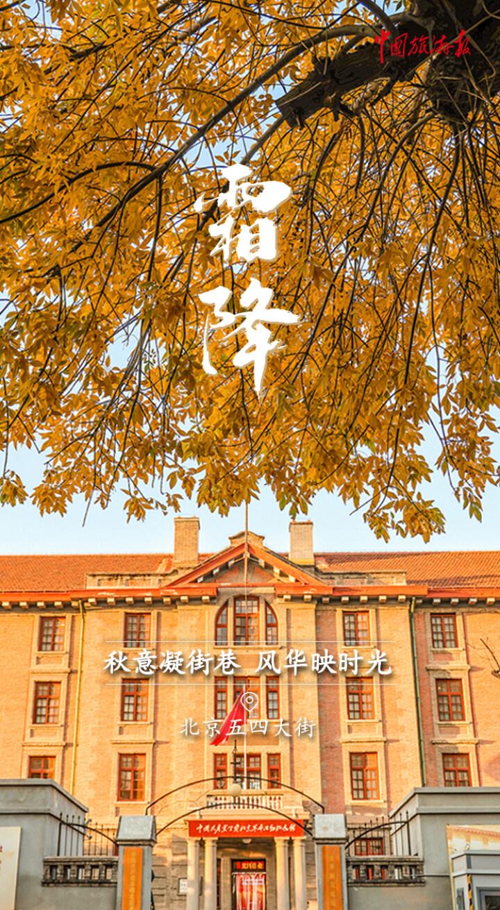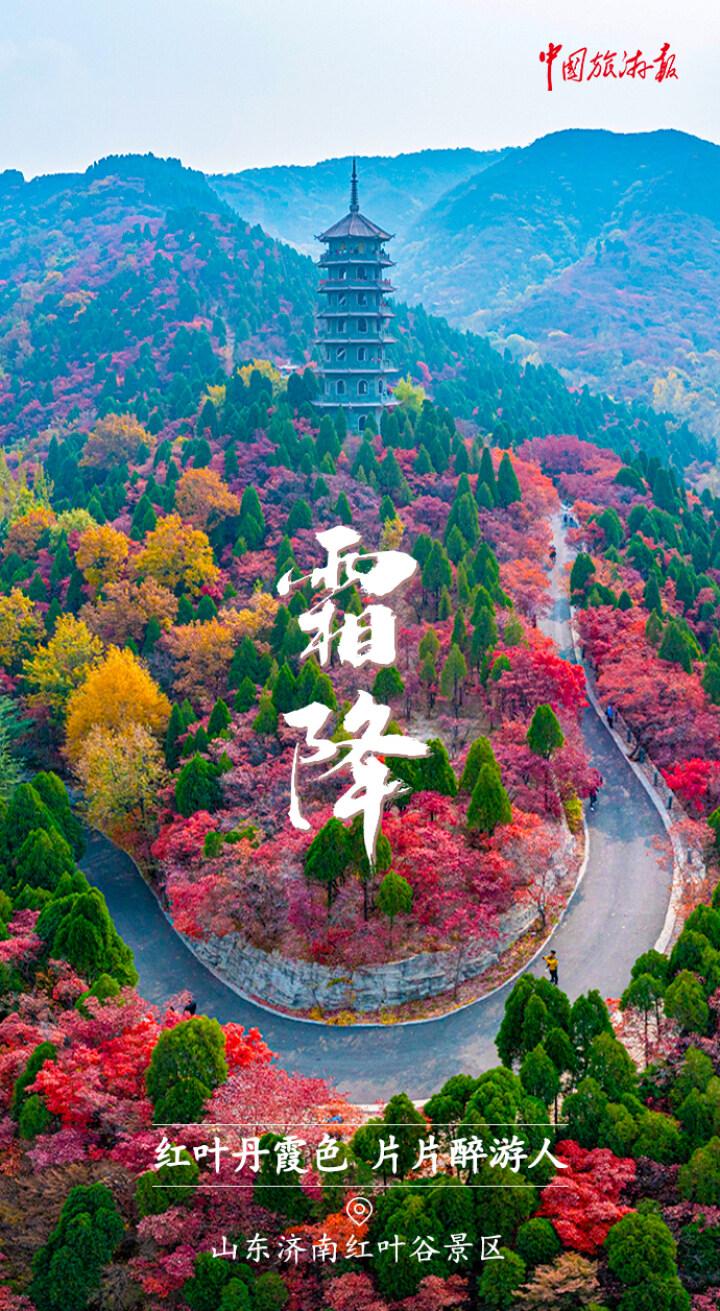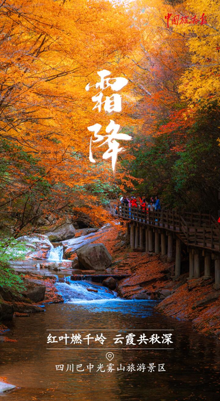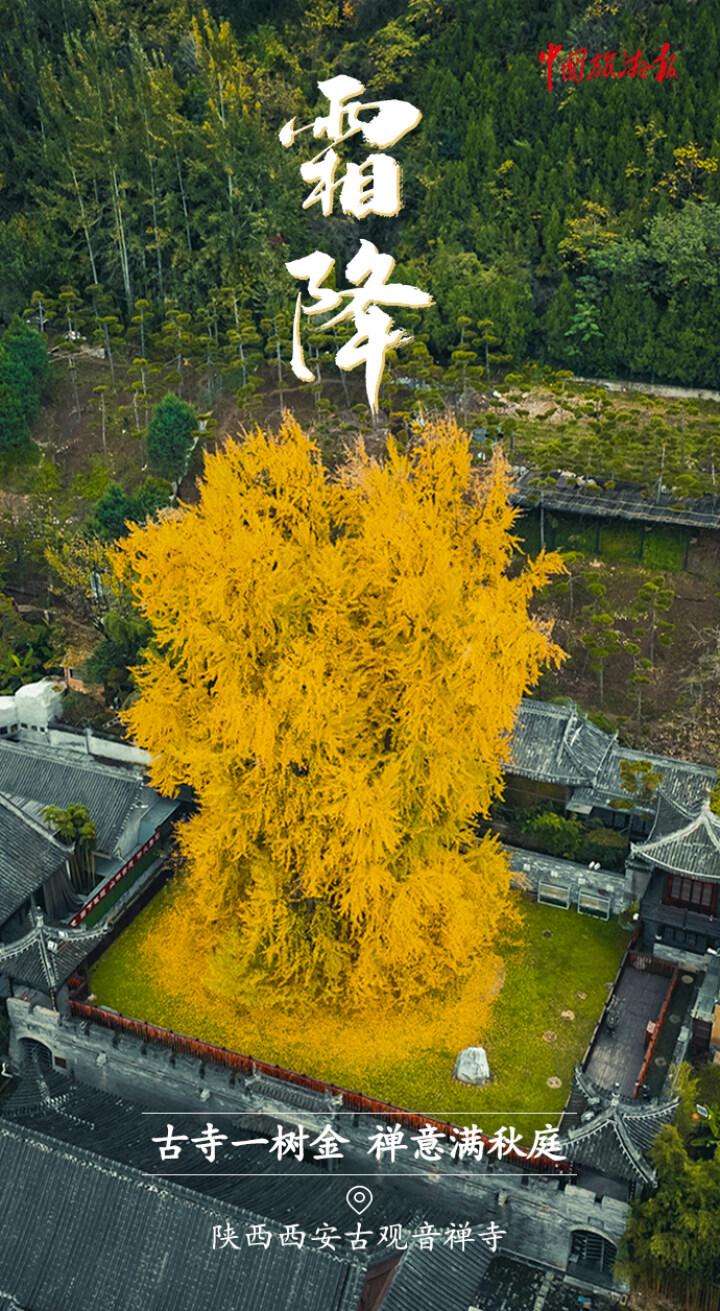 作爲秋季的終章,霜降將時節的韻味推向極致。風攜着涼意漫過山河,悄悄點染了枝葉,讓大地披上最絢爛的秋衣。北京五四大街的白蠟樹褪綠染金、西安古觀音禪寺的銀杏葉鋪滿石階、巴中光霧山的紅葉層疊如霞……枝頭果實已摘,田間稻穀歸倉,連空氣裏都瀰漫着豐收的甜潤。