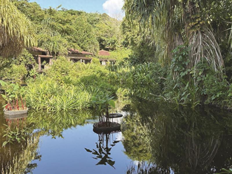 穿過香草花園往前走,有一個生態池。“生態池是整個度假區設有的6個集水區之一,建造生態池主要是爲了豐富度假區內的生物多樣性,並吸引那些在度假區開放之前就已經棲息在聖淘沙島溼地和沿海的物種,助力保護和恢復當地的生態系統。”工作人員說,“生物窪地能夠過濾山上流下來的地表水,所以在水流入生態池之前,我們不需要再使用任何化學藥劑來淨化。生態池最常見的物種就是有健康生態系統標誌的蜻蜓,偶爾能看到短暫來訪的海狸,另外就是各種蝴蝶、鳥類,甚至水蜥蜴。”