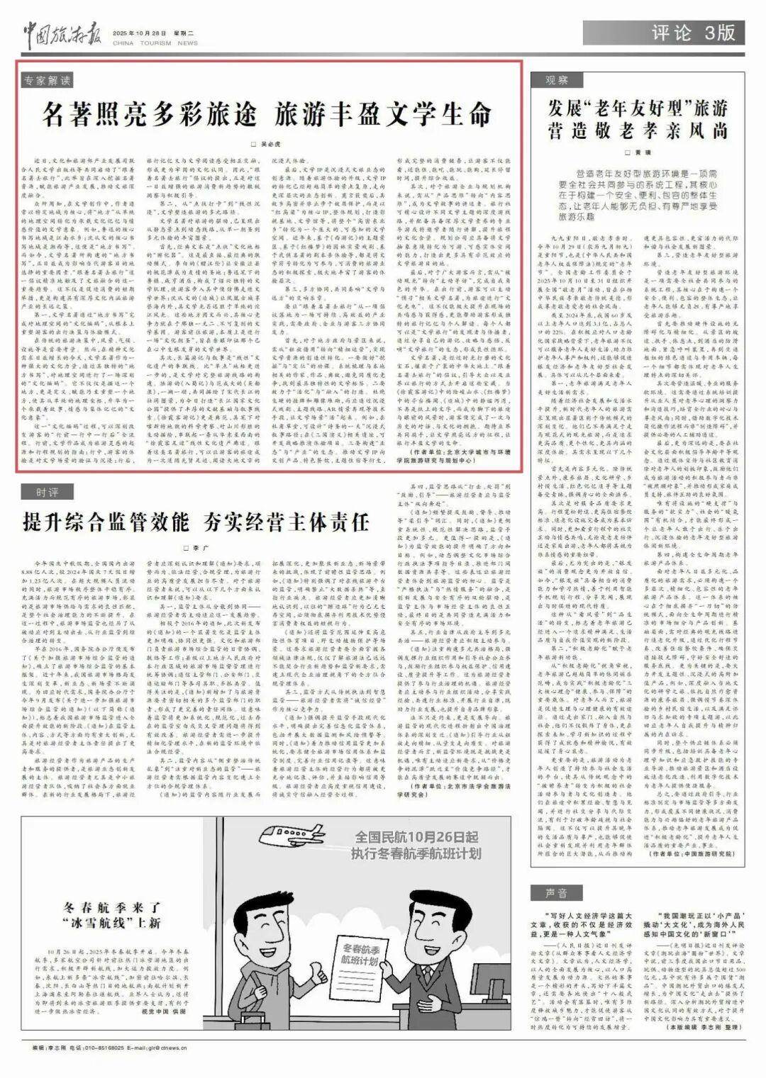 文學名著,是經過時光打磨的文化寶石,鑲嵌於廣袤的中華大地上。“跟着名著去旅行”的倡議,引導大衆以及業界以旅行的方式去開啓這些寶藏。當《徐霞客遊記》中的險峻山水、《紅樓夢》中的亭臺樓閣、《邊城》中的靜謐河灣,不再是紙上的文字,而成爲腳下的旅途與眼前的風景時,遊客便完成了一次與歷史的對話、與文化的擁抱。期待業界共同攜手,讓文學照亮遠方的征程,讓旅行豐盈文學的生命。