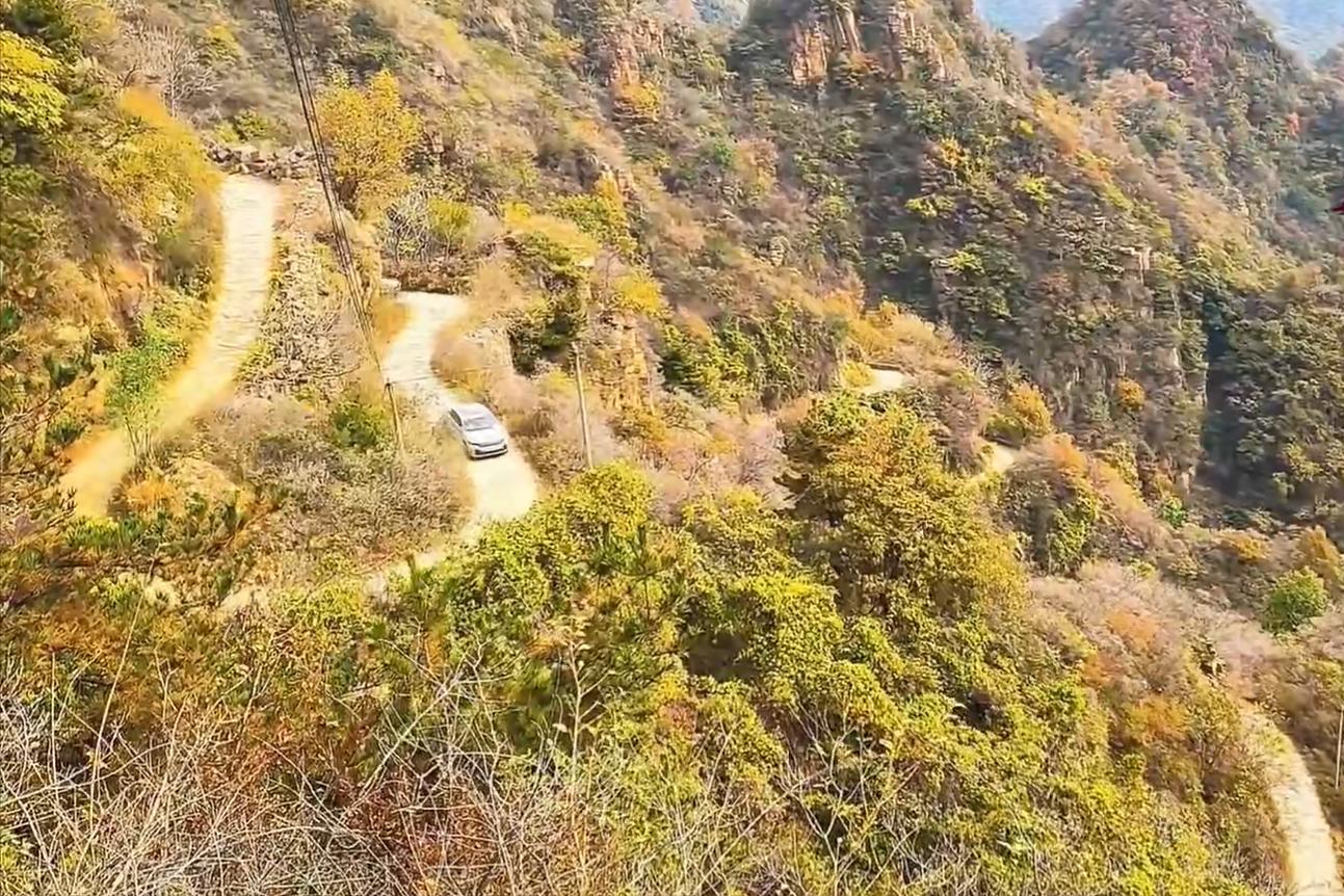 西井山掛壁公路,這條九曲十八折的道路纏繞在海拔1200米的崖壁上,洞窗如鏡,框住漫山黃櫨與山楂的漸變色彩。
