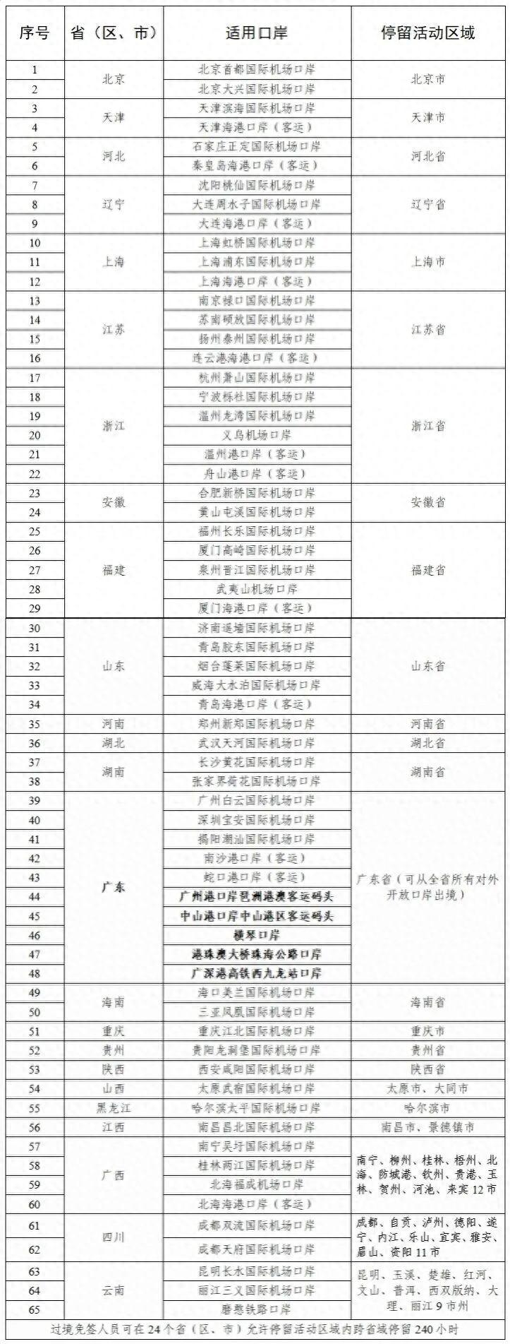 240小時過境免籤政策適用口岸和停留活動區域