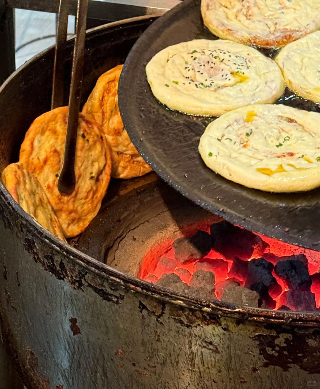 牛肉餅,現點現做,有辣和不辣兩種口味,餅子做好放一張大平底鐵鍋上,先煎後烤,口感酥脆,一咬就掉渣。